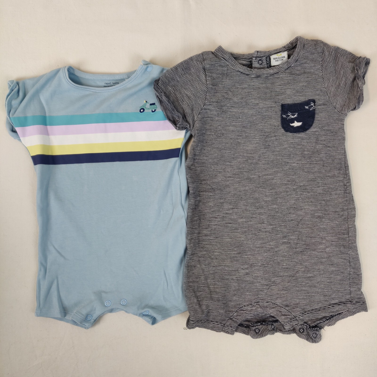 Autres commentaires : 2 combicourts: une bleu foncée avec des rayures fines blanches. L’autre bleu avec des rayures multicolores et des boutons pressions à l’épaule.