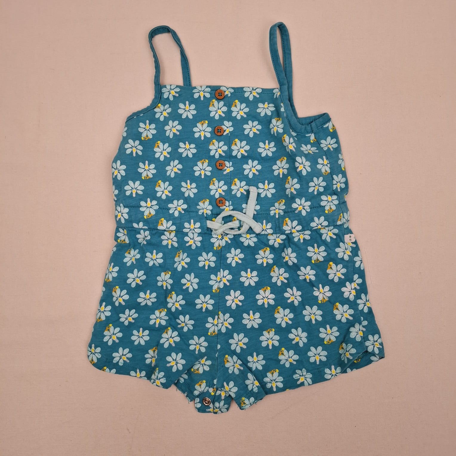 Autres commentaires : Combicourt à bretelles bleu, fermeture par boutons pression à l’entrejambe, taille élastiquée avec cordons.