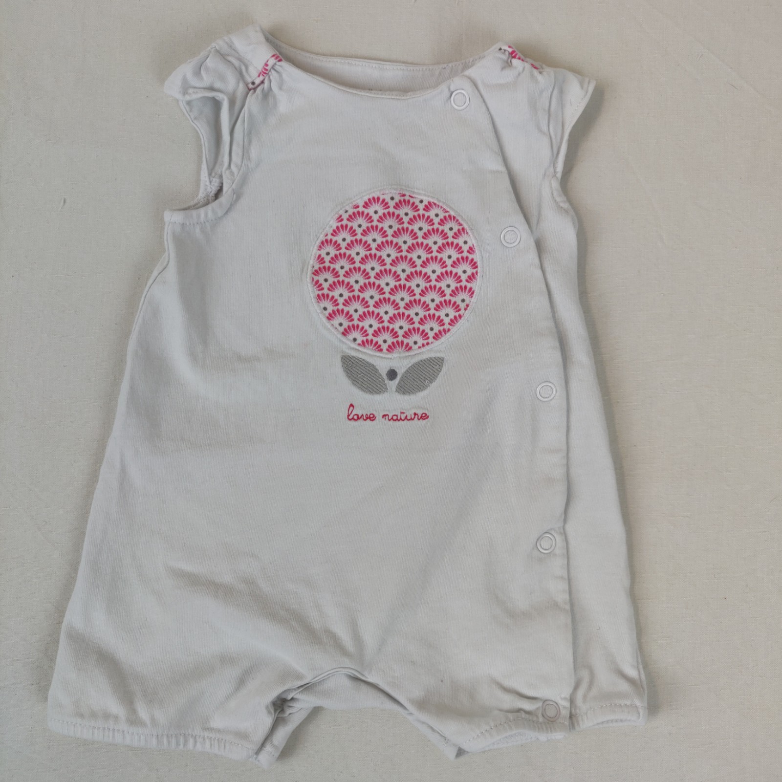 Autres commentaires : Combi-short manches courtes blanc à motifs floraux fuschia et inscription « Love nature ». Fermeture par boutons pressions à l’avant côté gauche.