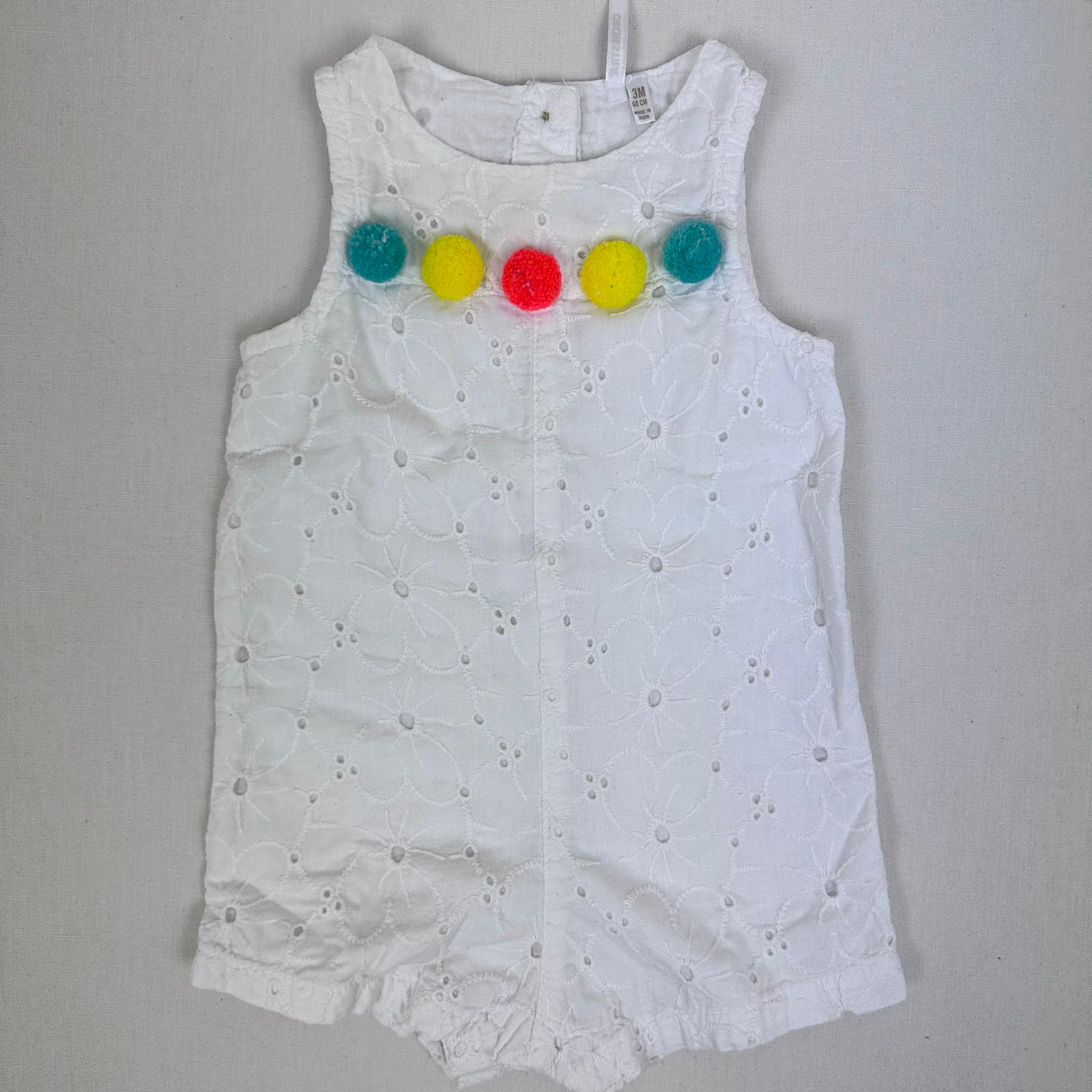 Autres commentaires : Combicourt blanc sans manches, une fermeture par boutons au dos et des petites boules multicolores.