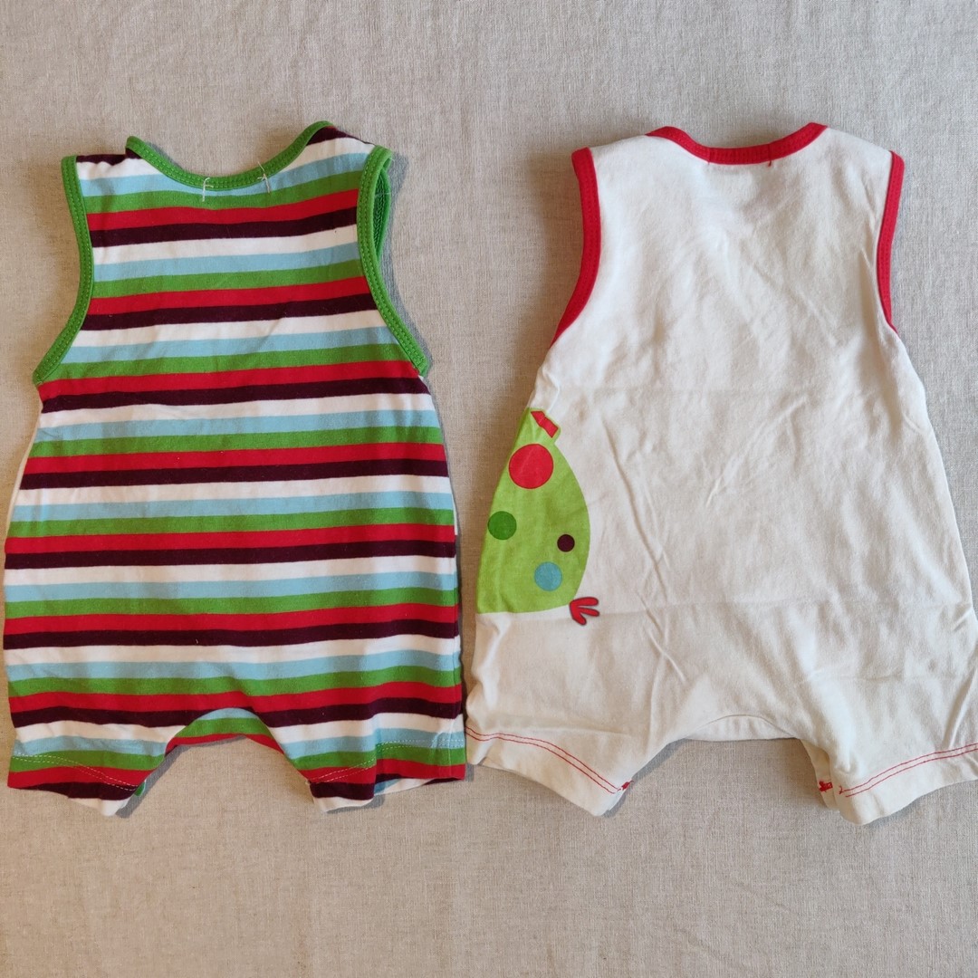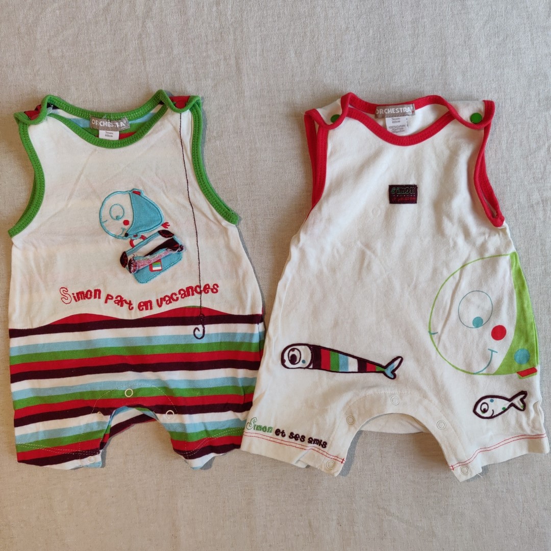Autres commentaires : Lot de 2 combinaisons short sur fond beige, thème Simon le poisson : sur celle à bretelles rouges, Simon est avec ses amis, sur celle à bretelles vertes, Simon par en vacances, et sa valise s’ouvre. Fermeture par boutons pression aux épaules et à l’entrejambe