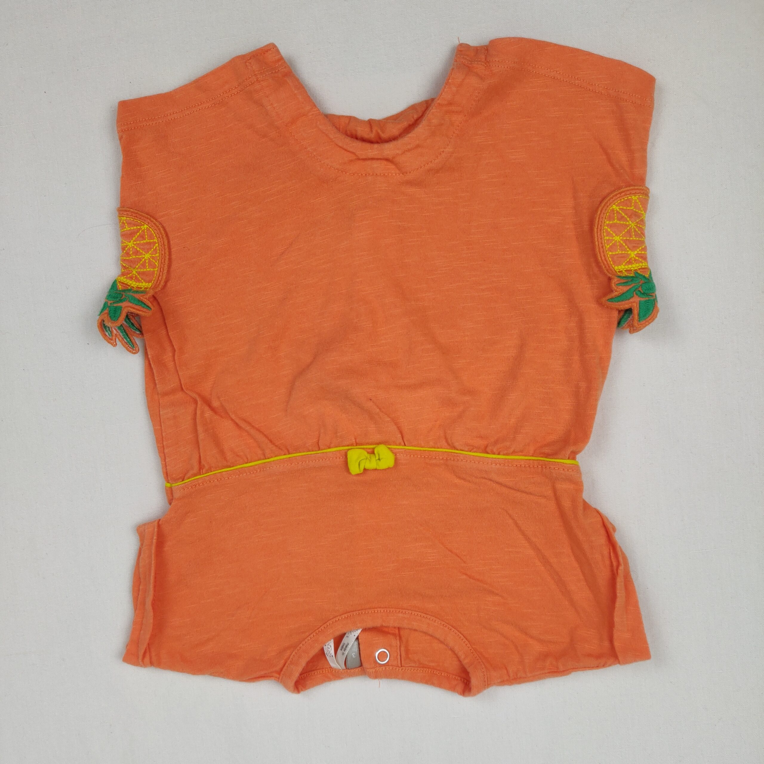 Autres commentaires : Combishort orange à manches courtes, fermé par boutons pression, motif ananas sur les cuisses et petit noeud jaune au ventre.