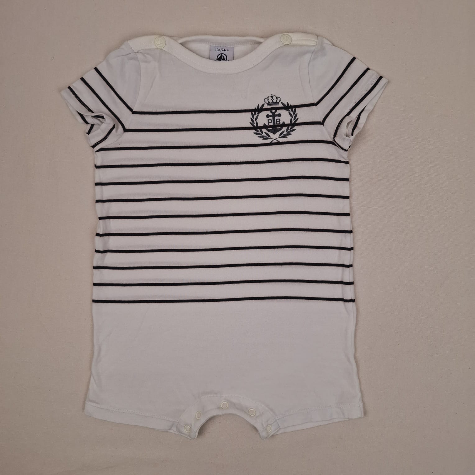 Autres commentaires : Combicourt blanc avec des rayures marron foncé, Petit Bateau, 12 mois, illustration d’un logo avec une Ancre et PB les initials de la marque,col rond avec un bouton pression sur le coté pour ouvrir le col, boutons pression au niveau de l’entrejambe pour ouvrir le vêtement.