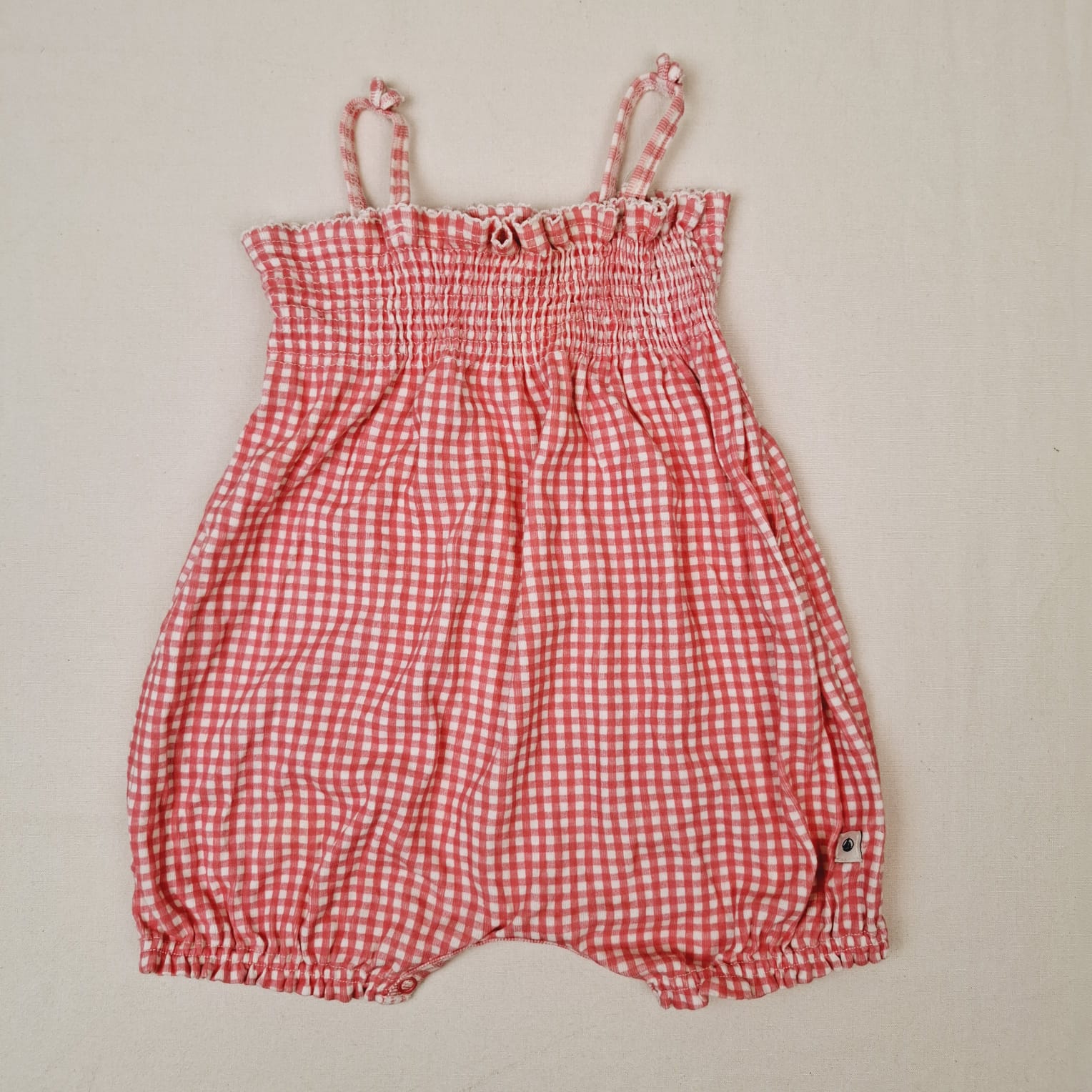 Autres commentaires : Combicourt à bretelles et à smocks, imprimé vichy rose, bustier et cuisses élastiqués, fermeture à l’entrejambe par boutons pression.