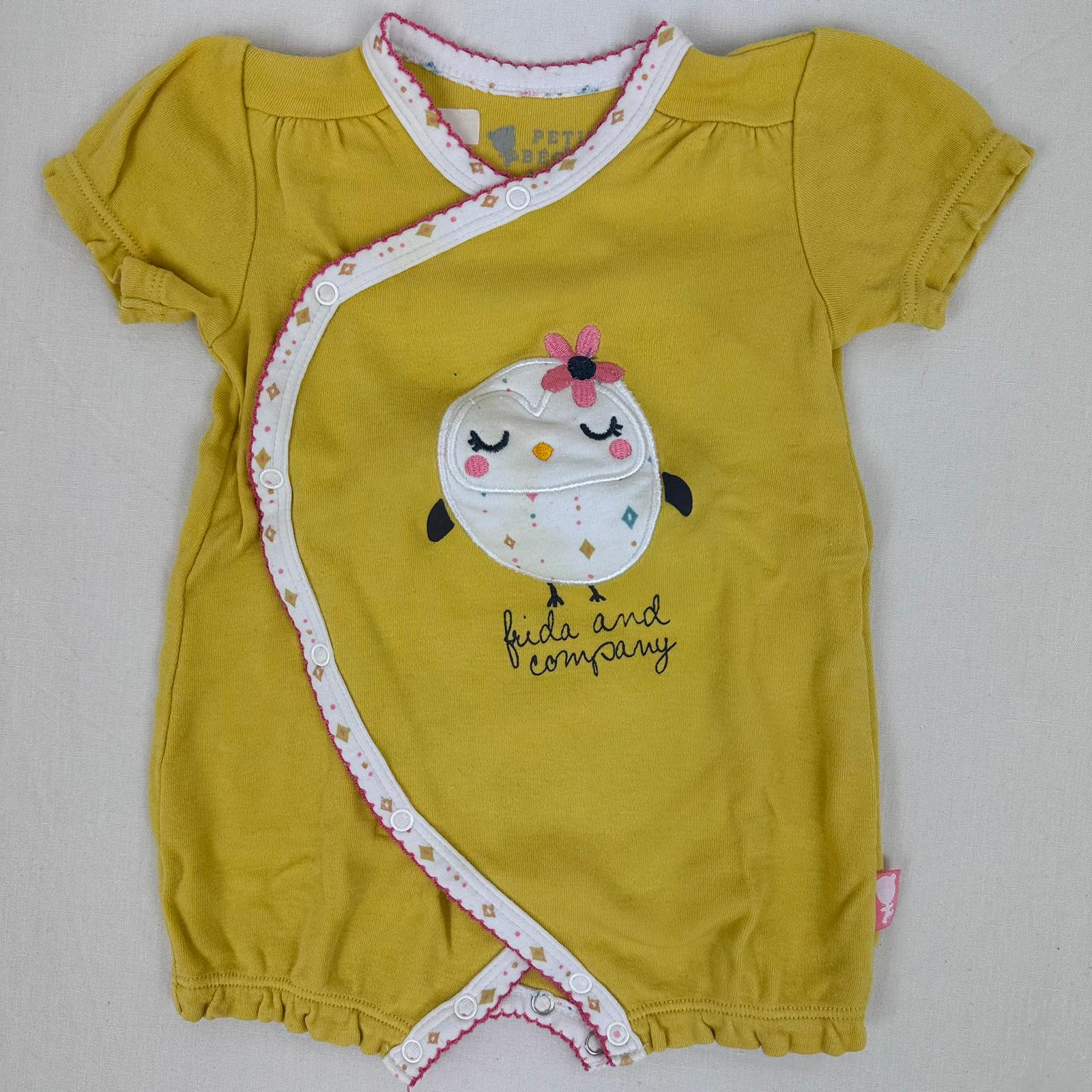 Autres commentaires : Combicourt manches courtes jaunes avec une fermeture devant par boutons pressions à partir du col jusqu’en bas et un motif d’oiseau.
