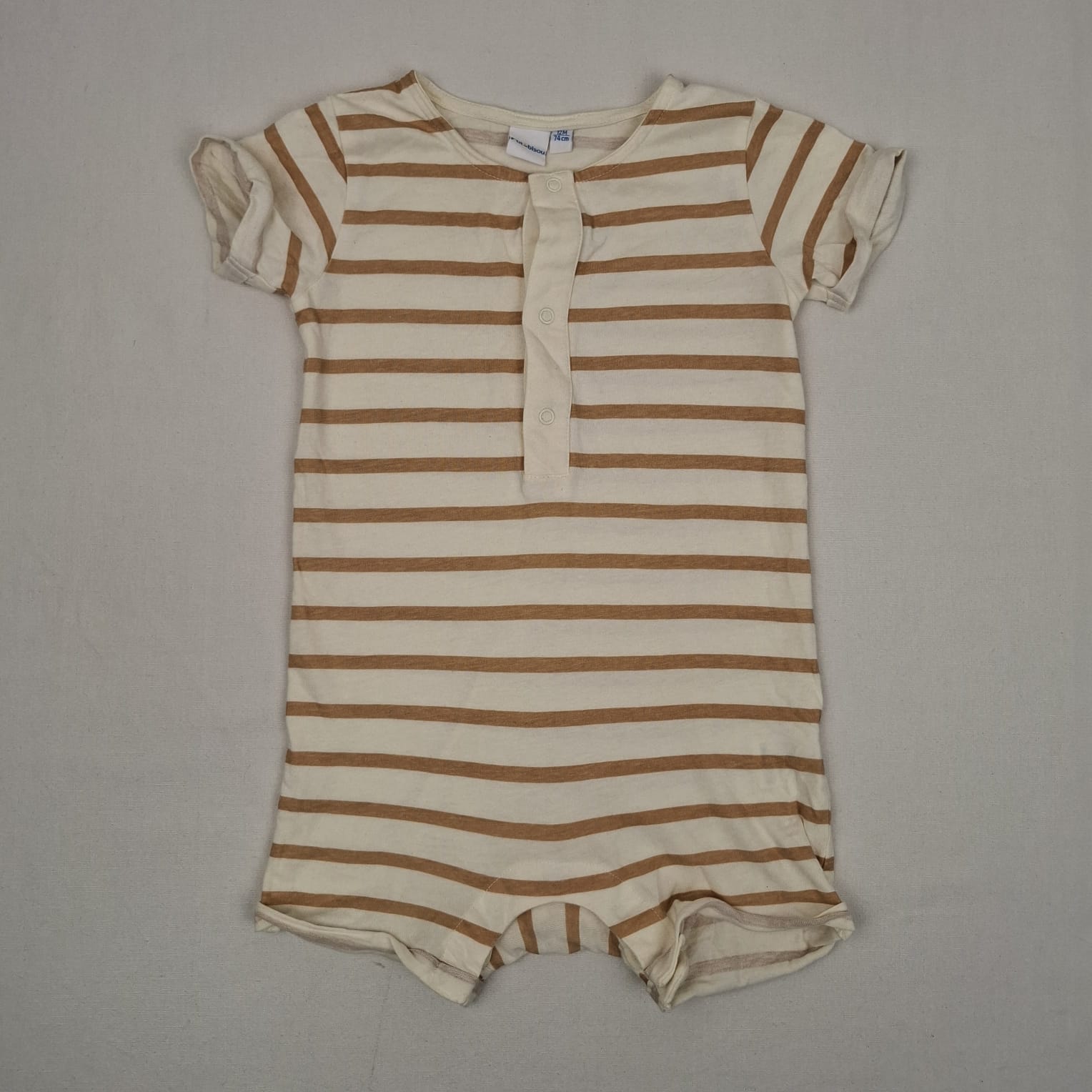 Autres commentaires : Combicourt beige clair à rayures marron à manches courtes, col rond, fermeture par boutons pression devant et à l’entrejambe.