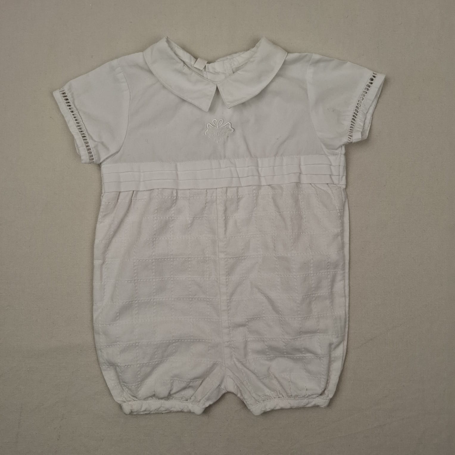Autres commentaires : Combicourt blanc vintage à manches courtes, col chemise, fermeture par boutons au dos.
