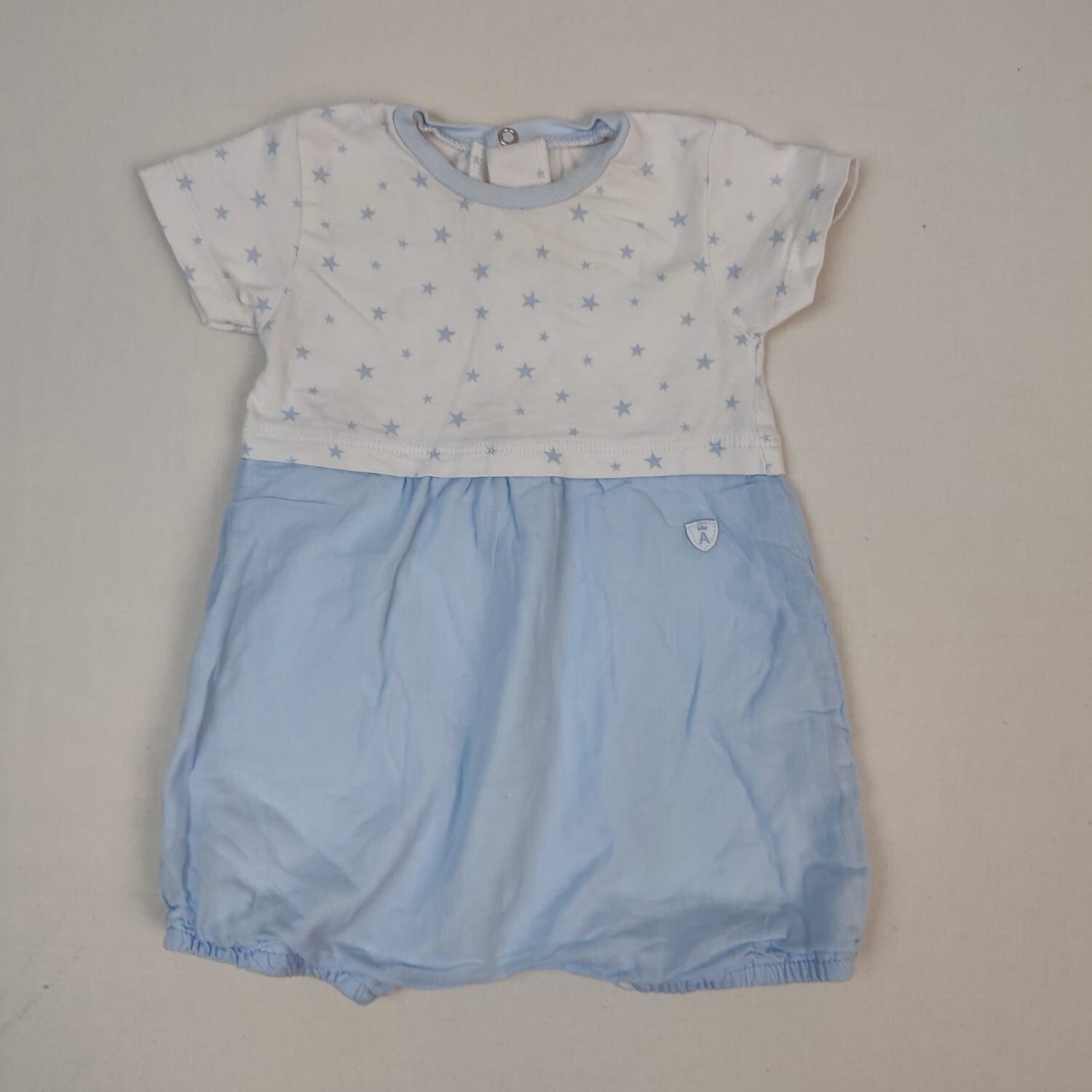 Autres commentaires : 6% élasthanne. Combicourt à manches courtes bleu clair, haut blanc à motifs étoiles bleu clair, fermeture par boutons pression au dos et à l’entrejambe.