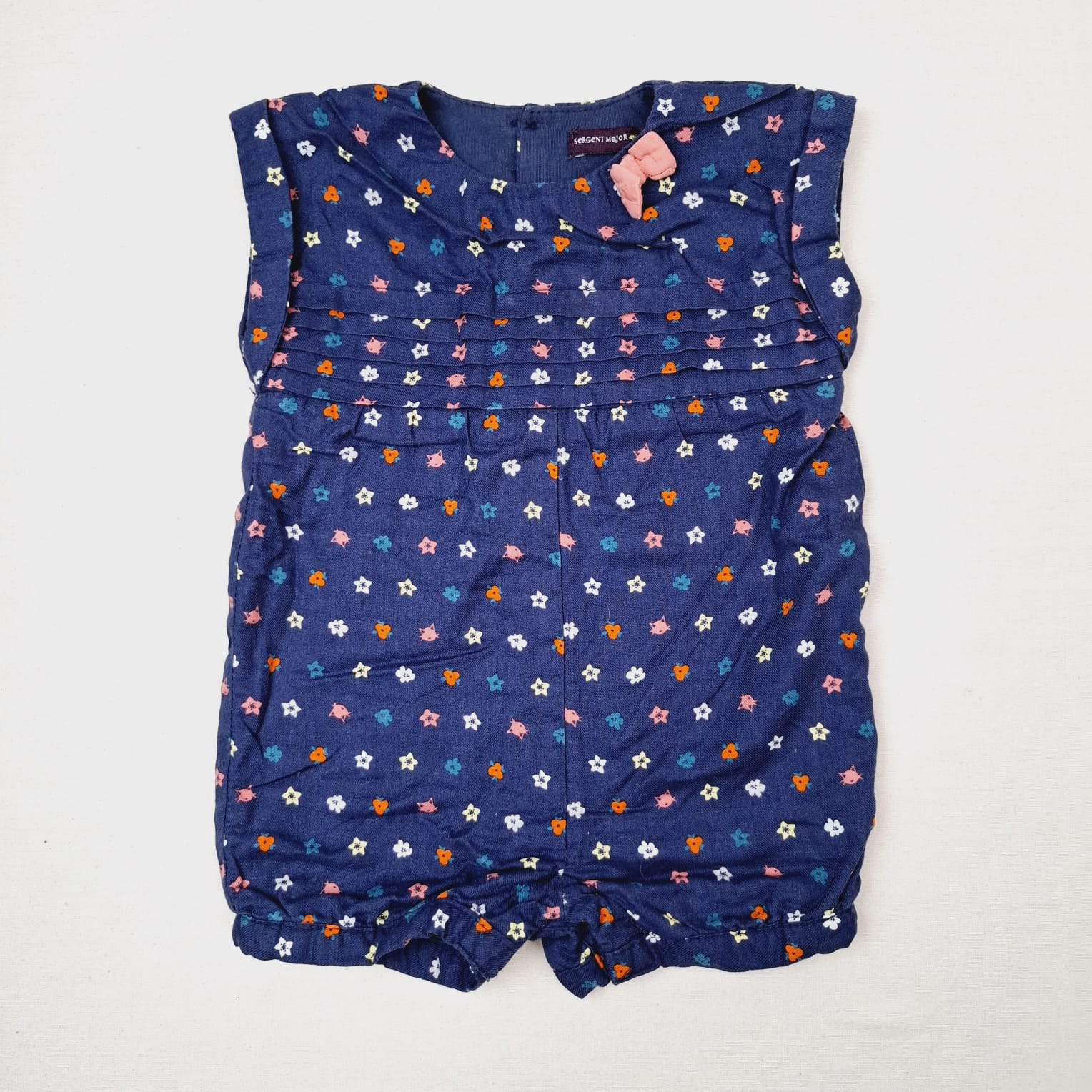 Autres commentaires : Combicourt sans manches bleu foncé, imprimé têtes de chat et fleurs multicolores, col rond avec un noeud rose latéral, revers au niveau des emmanchures, fermeture par petits boutons dans le dos et par boutons pression à l’entrejambe, coton 100% et doublure 60% coton et 40% polyester.