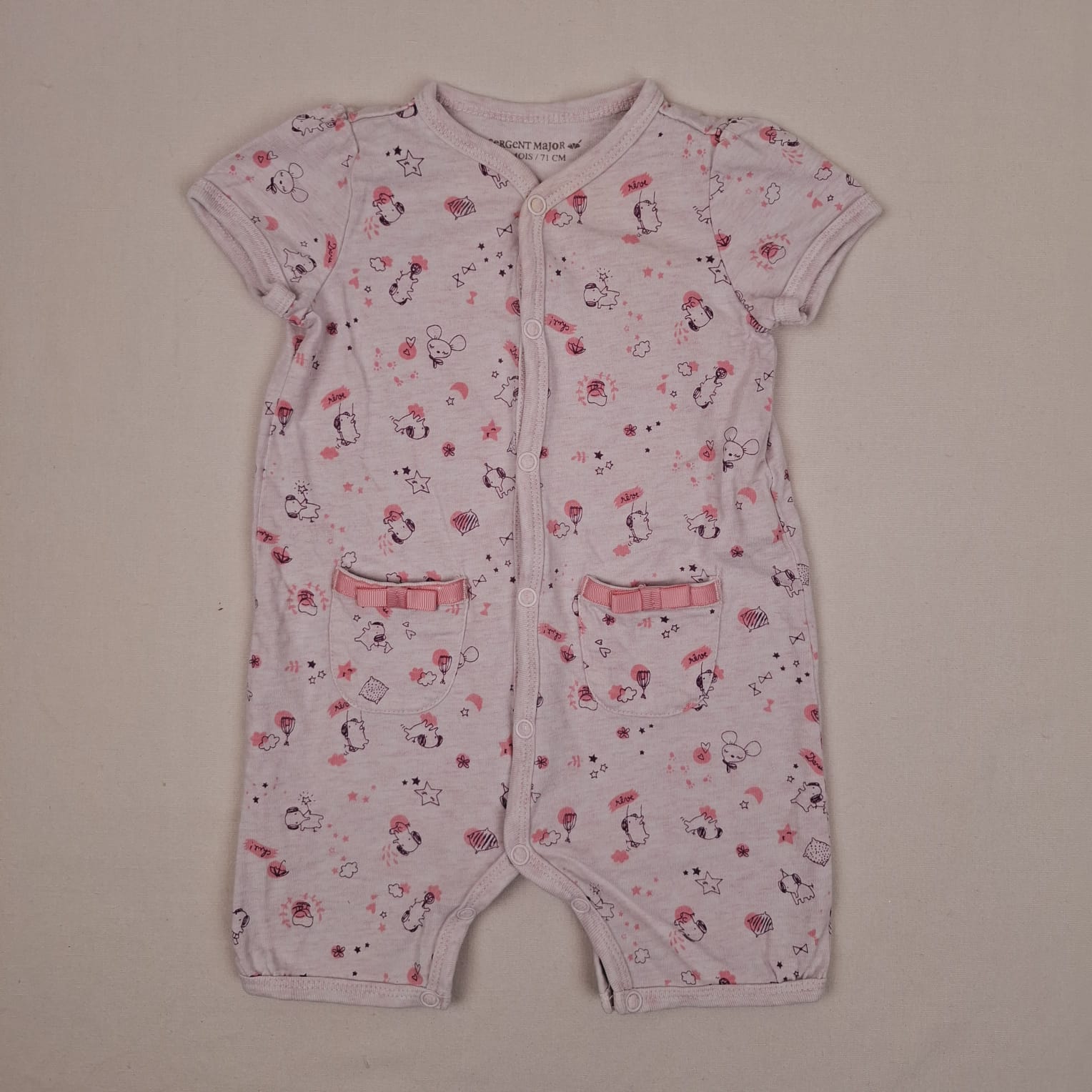 Autres commentaires : Combicourt Sergent major 9M dans les tons rose avec motifs éléphants souris , fermeture boutons pressions à l’avant et au niveau des jambes