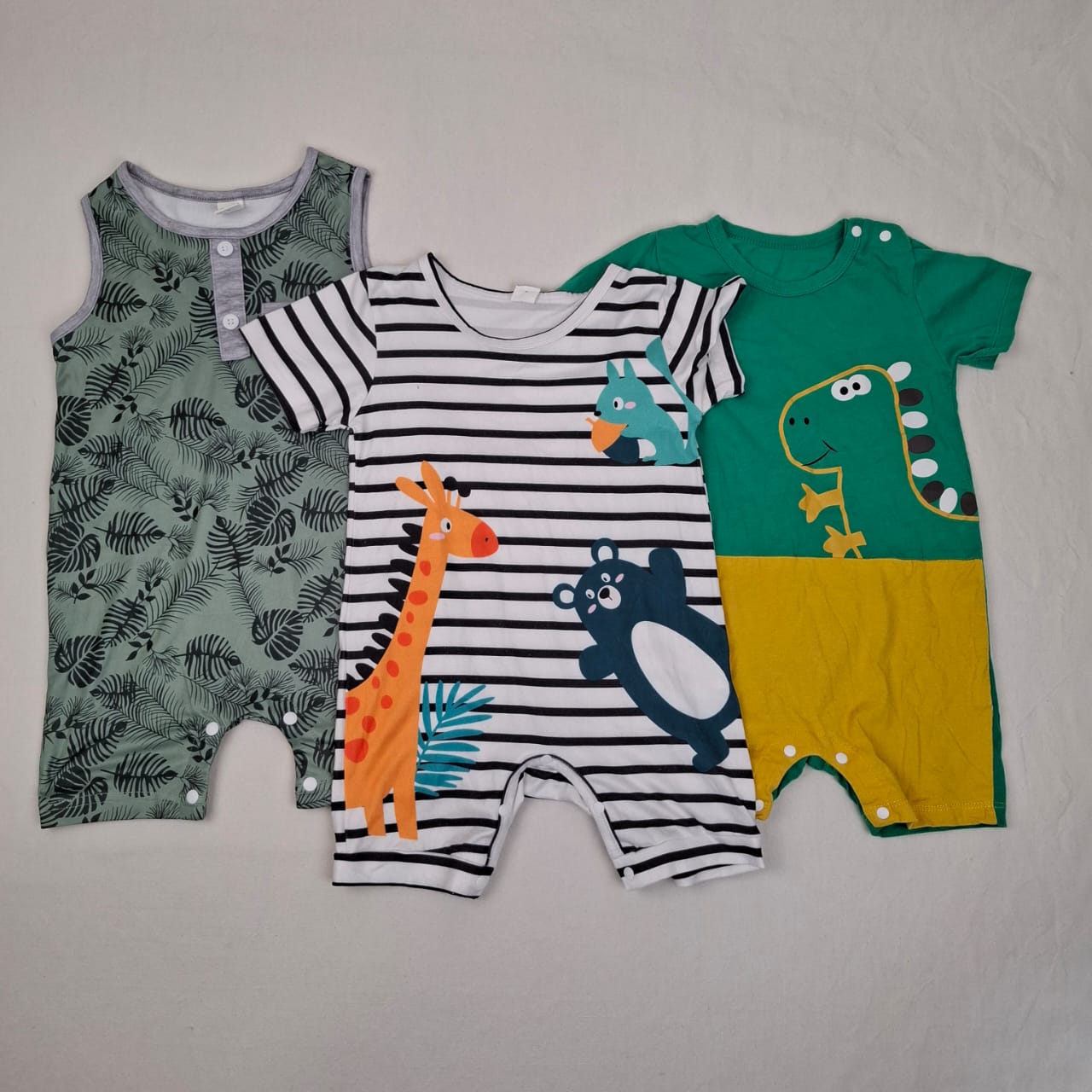 Autres commentaires : Lot de 3 combicourte shein 2A dont un blanche rayé noir avec motifs animaux , une verte motif dinosaure et une sans manche verte camouflage