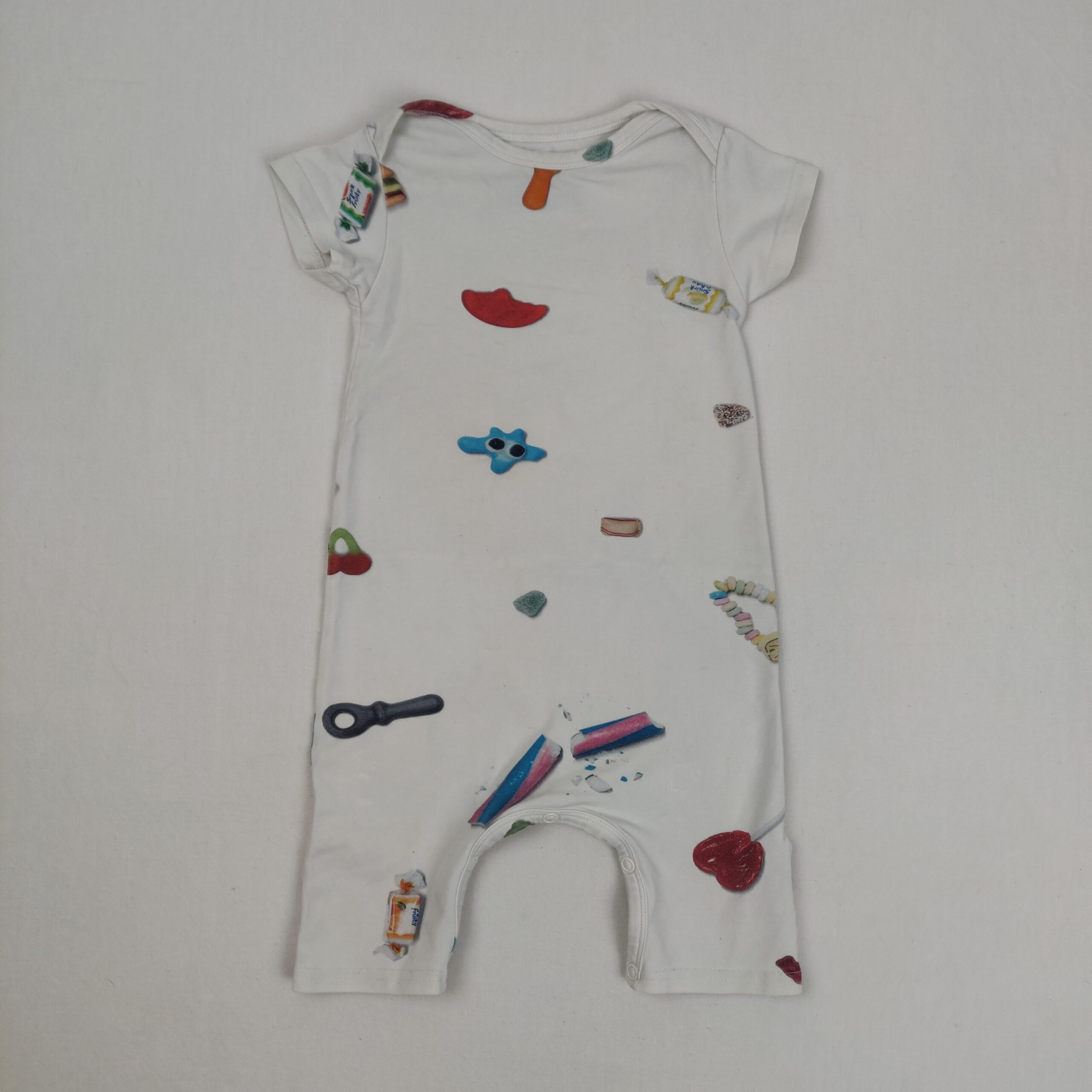 Autres commentaires : 8% élasthanne – combicourt à manches courtes beige avec motifs photos de bonbons, fermeure à l’entrejambe par boutons pression.