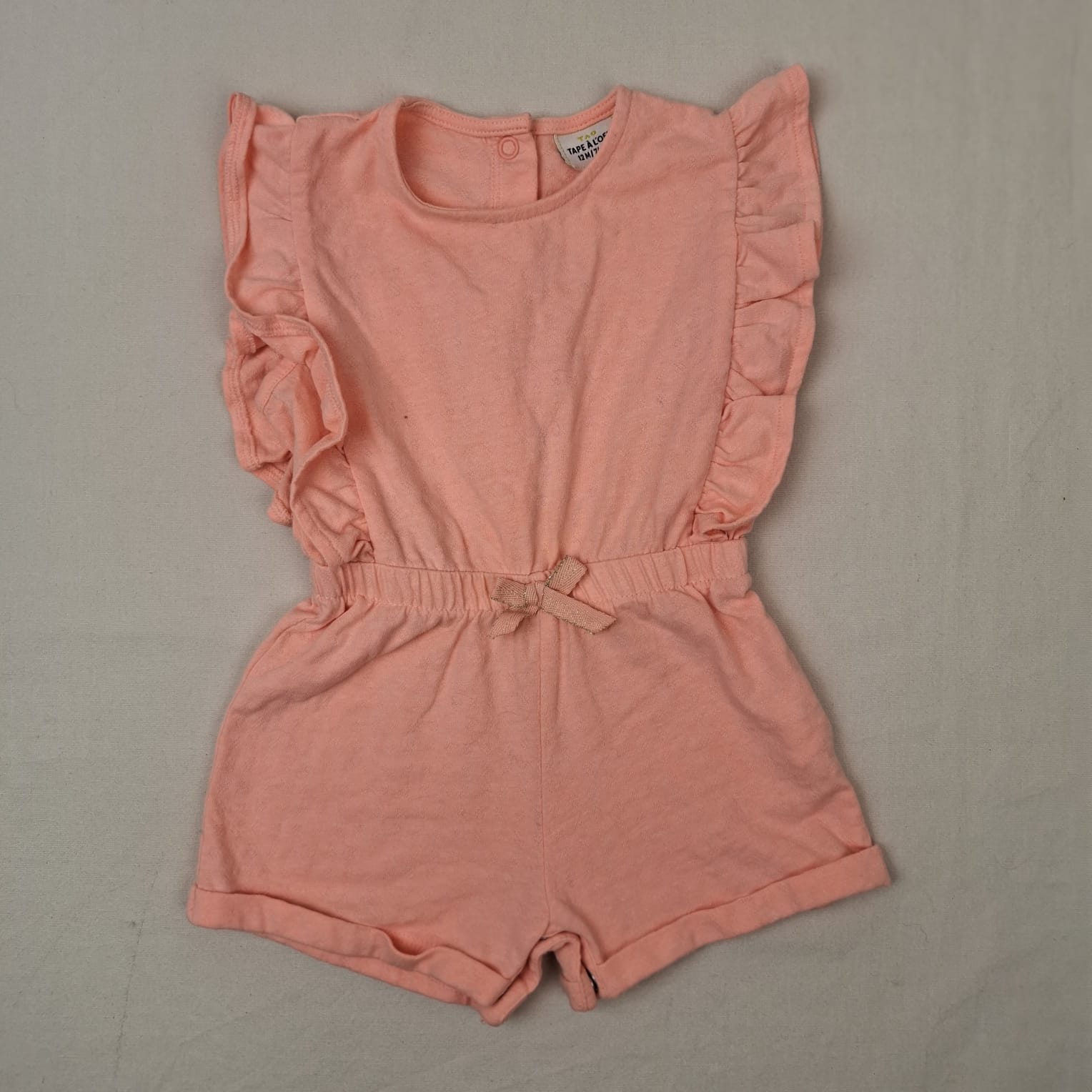 Autres commentaires : 40% polyester. Combishort retroussé orange-saumon sans manches,volants sur les épaules, taille élastique, fermeture par boutons pression au dos et à l’entrejambes, noeud assorti devant sur la taille.