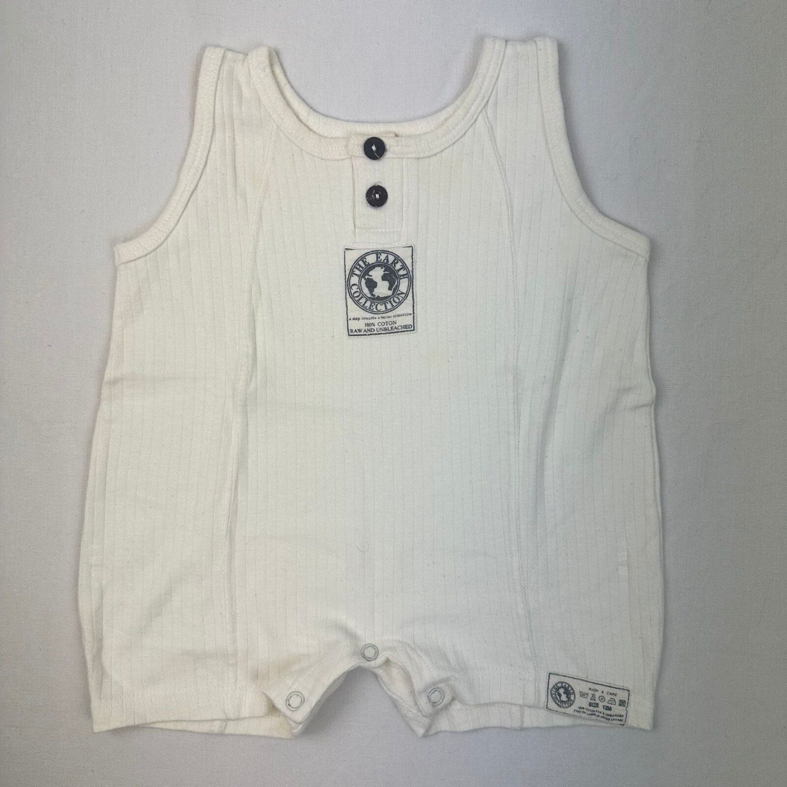 Autres commentaires : Combicourt sérrée en bretelles avec une fermeture par boutons pressions au niveau des jambes.Petit défaut: tâches jaunâtre au niveau du col assez visibles.