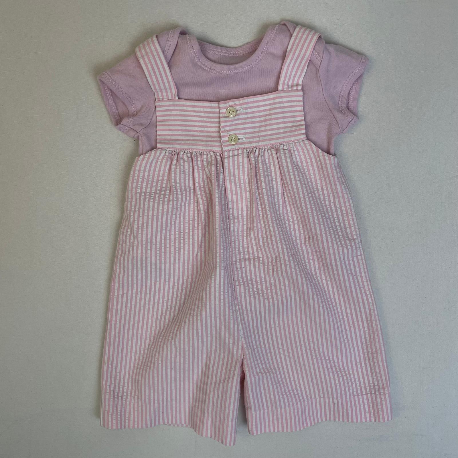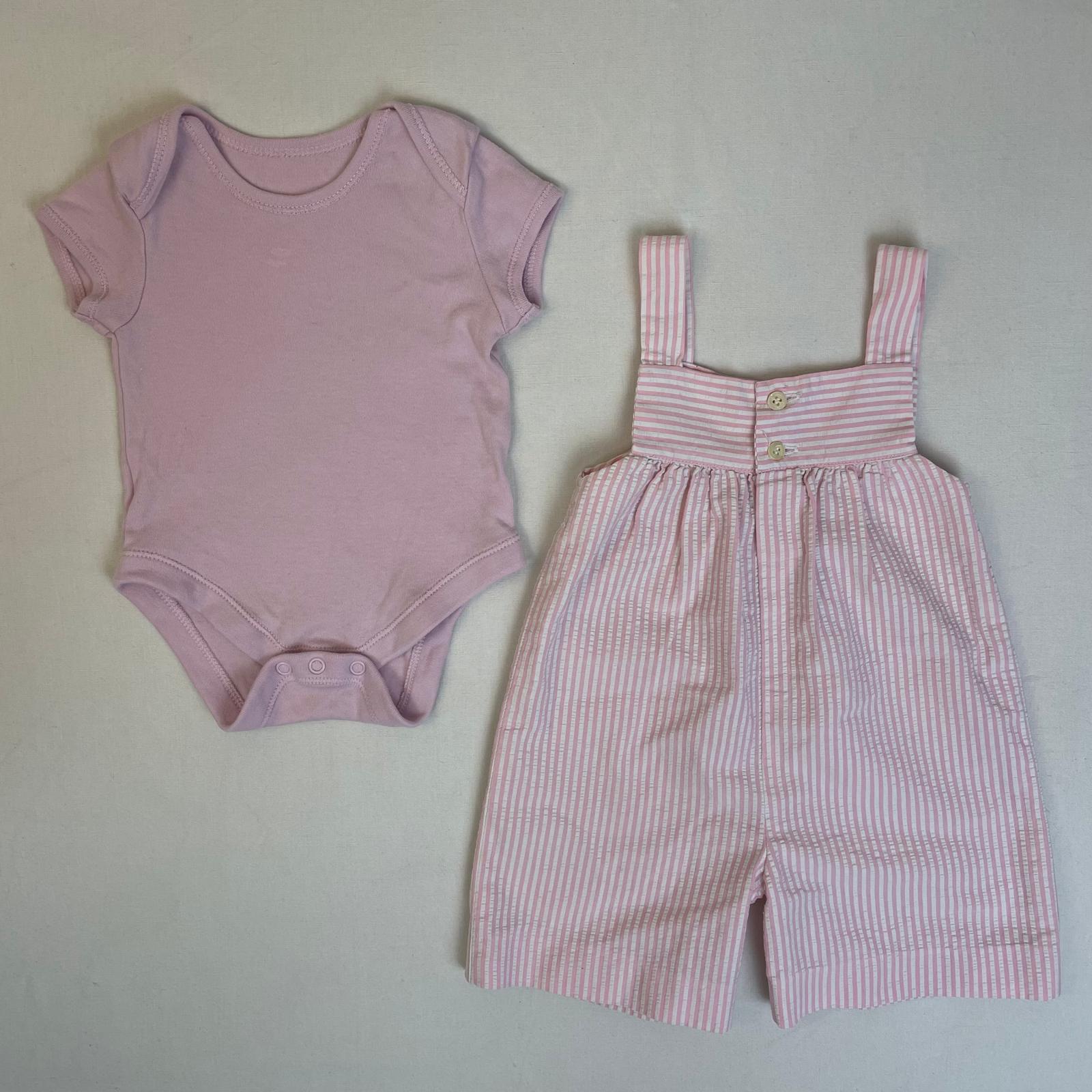 - Combinaison courte à bretelles vintage, tissu gaufré à rayures blanches et rose clair, fermeture devant par deux petits boutons. OFFERT : Body uni rose clair à manches courtes, sans manches en parfait état. Taille estimée 9M.