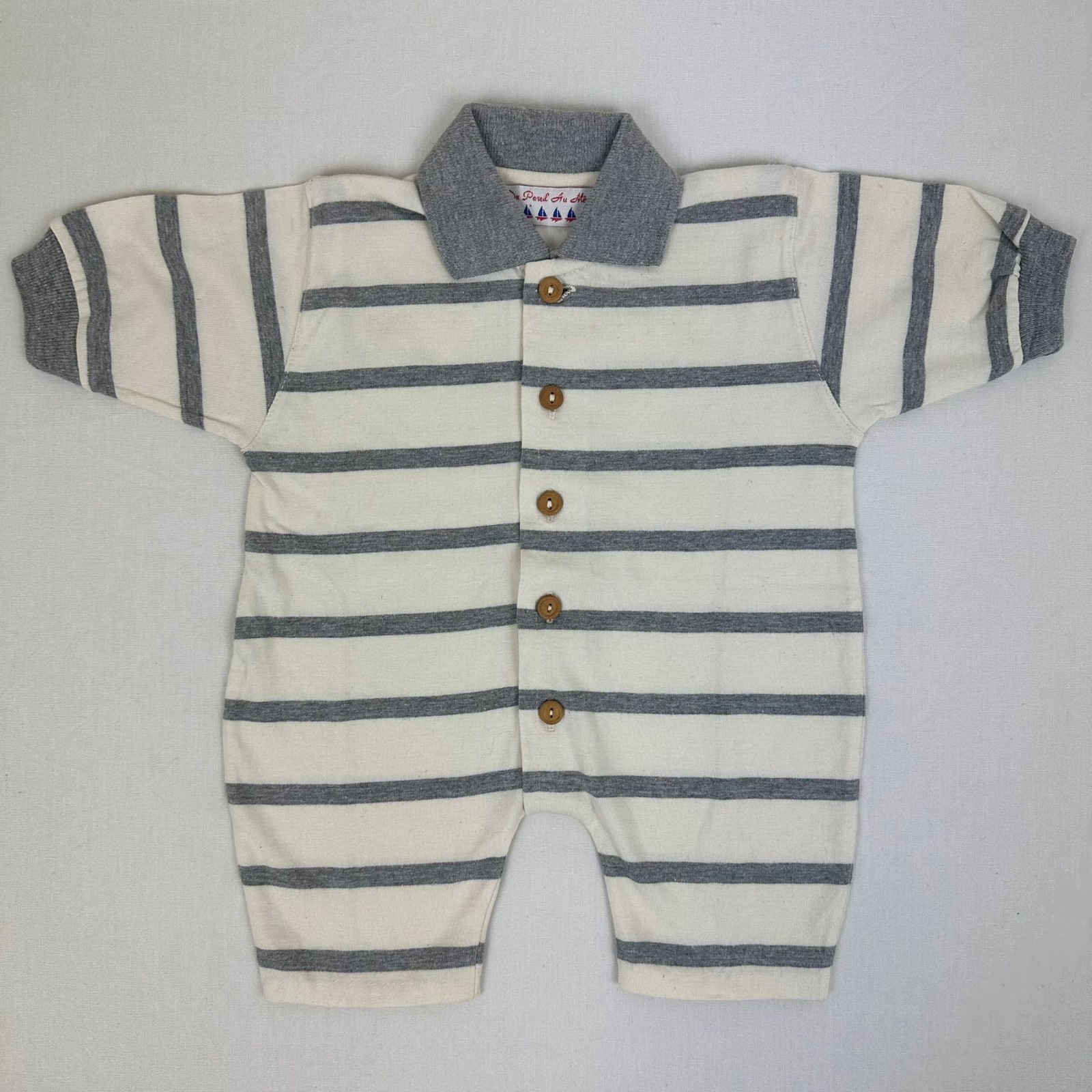 Autres commentaires : Combinaison courte beige avec rayures grises , col polo et une fermeture par boutons. Petit défaut: quelques tâches orangées sur la combinason. Niveau réduit de Fraise à Myrtille.