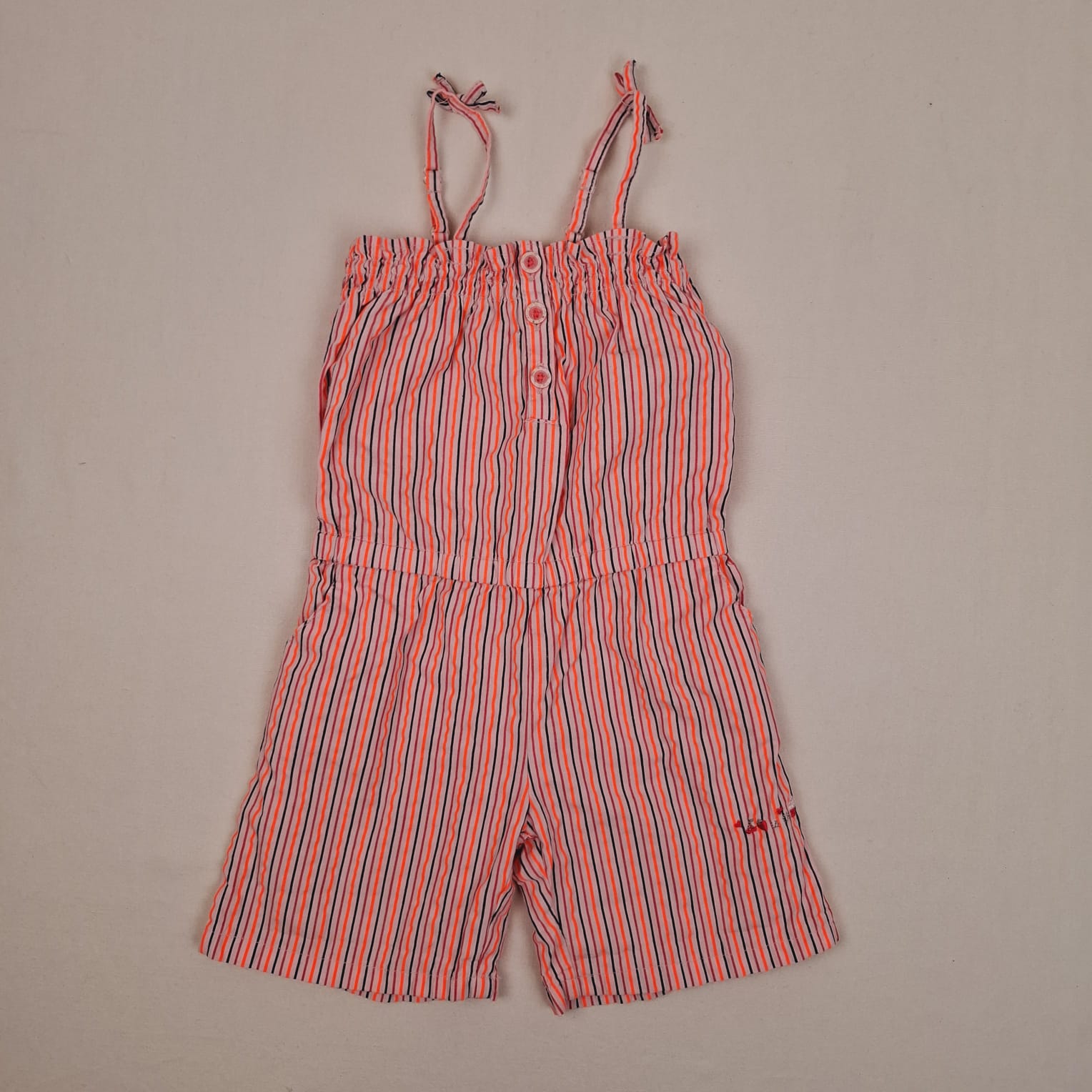 Autres commentaires : Combinaison courte et légère à bretelles avec petits noeuds, rose pâle à rayures verticales noires, orange fluo et rouge framboise, taille et buste élastiqués, fermeture par 3 petits boutons à l’encolure.