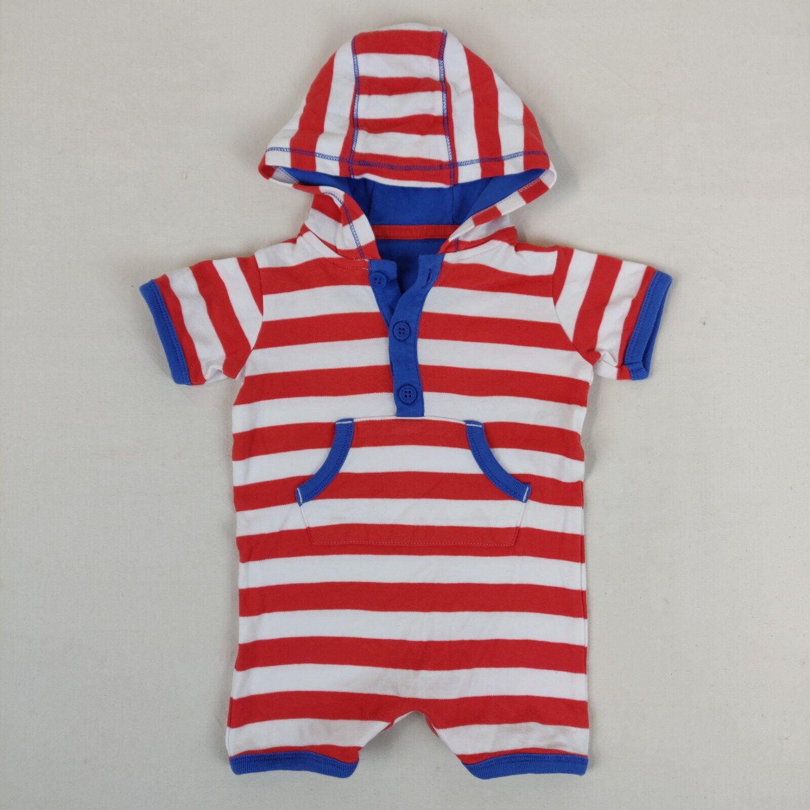 Autres commentaires : Combinaison courte à capuche avec des boutons et une poche . Contient 100% de coton et coloré en bleu , rouge , et blanc.