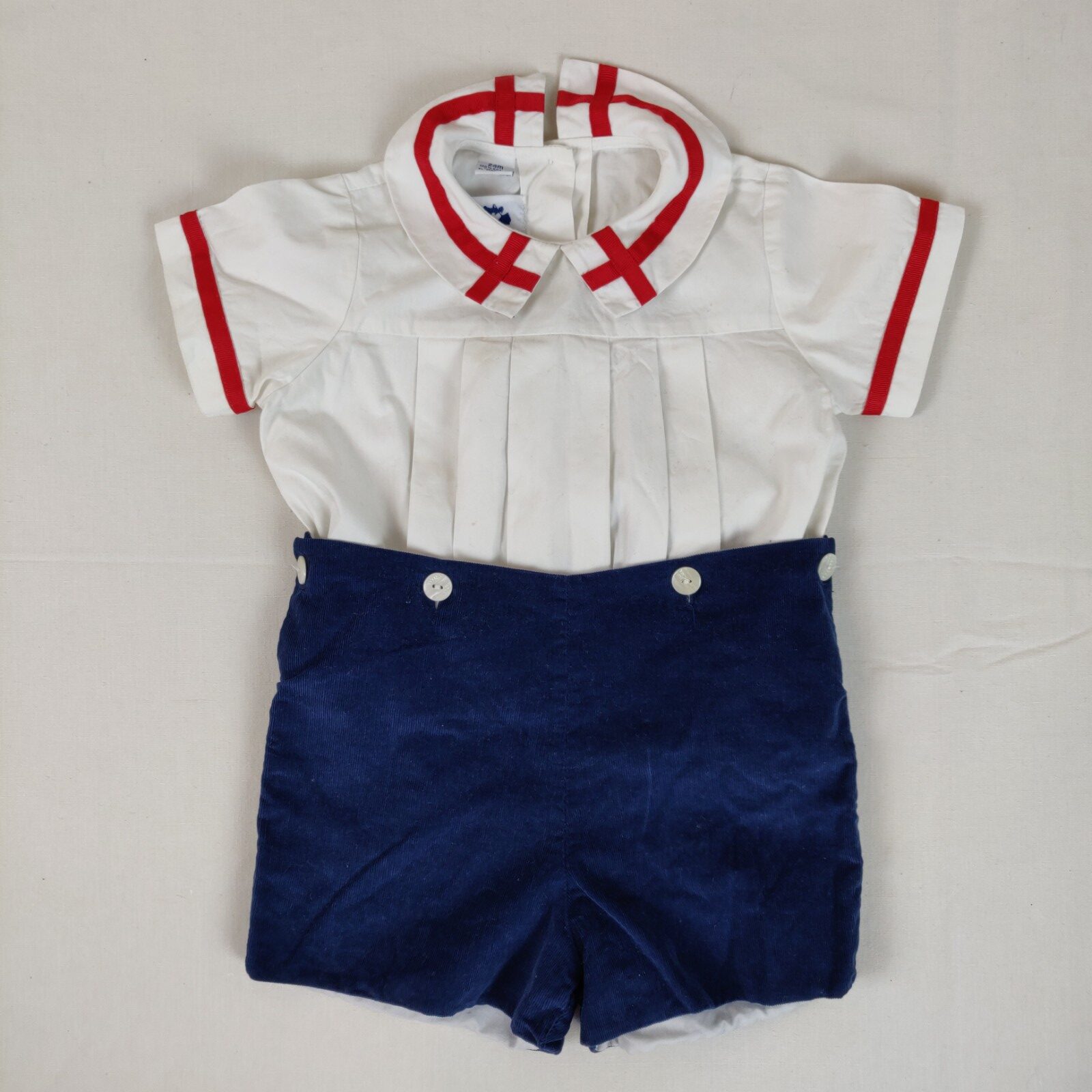 Autres commentaires : Combinaison courte composée de : une chemise blanche à manches courtes. Liseré rouge décoratif aux manches et au col. Ouverture centrale au dos à boutons classiques nacrés. Un short en fin velours côtelé bleu marine. La chemise s’attache au short par des boutons classiques nacrés. Très discrète tâche marron dans le bas de la chemise.