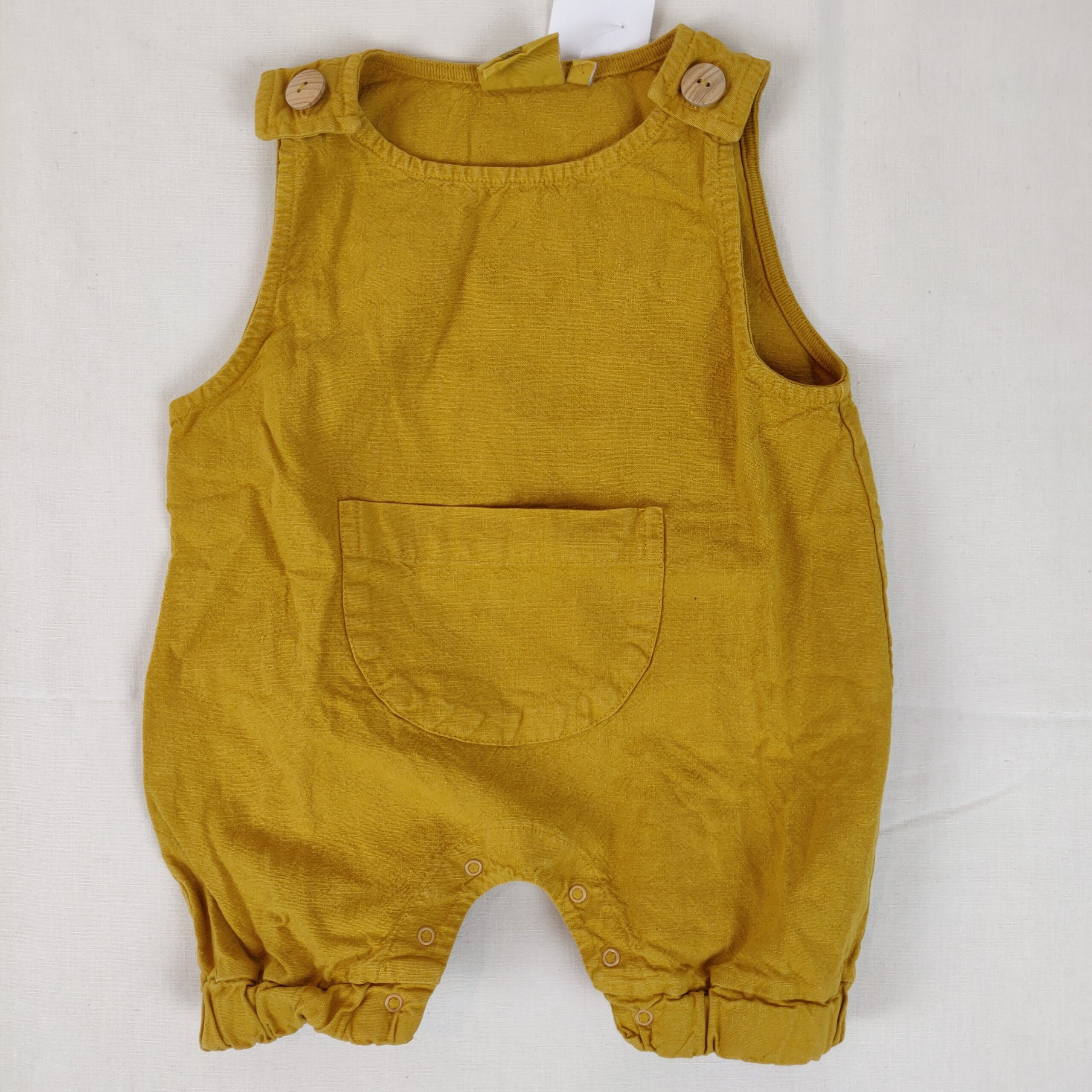 Autres commentaires : Combinaison courte à bretelles s’attachant sur le devant avec des boutons classiques – jaune/vert. Ouverture à l’entre-jambe à boutons pressions. Large poche centrale.