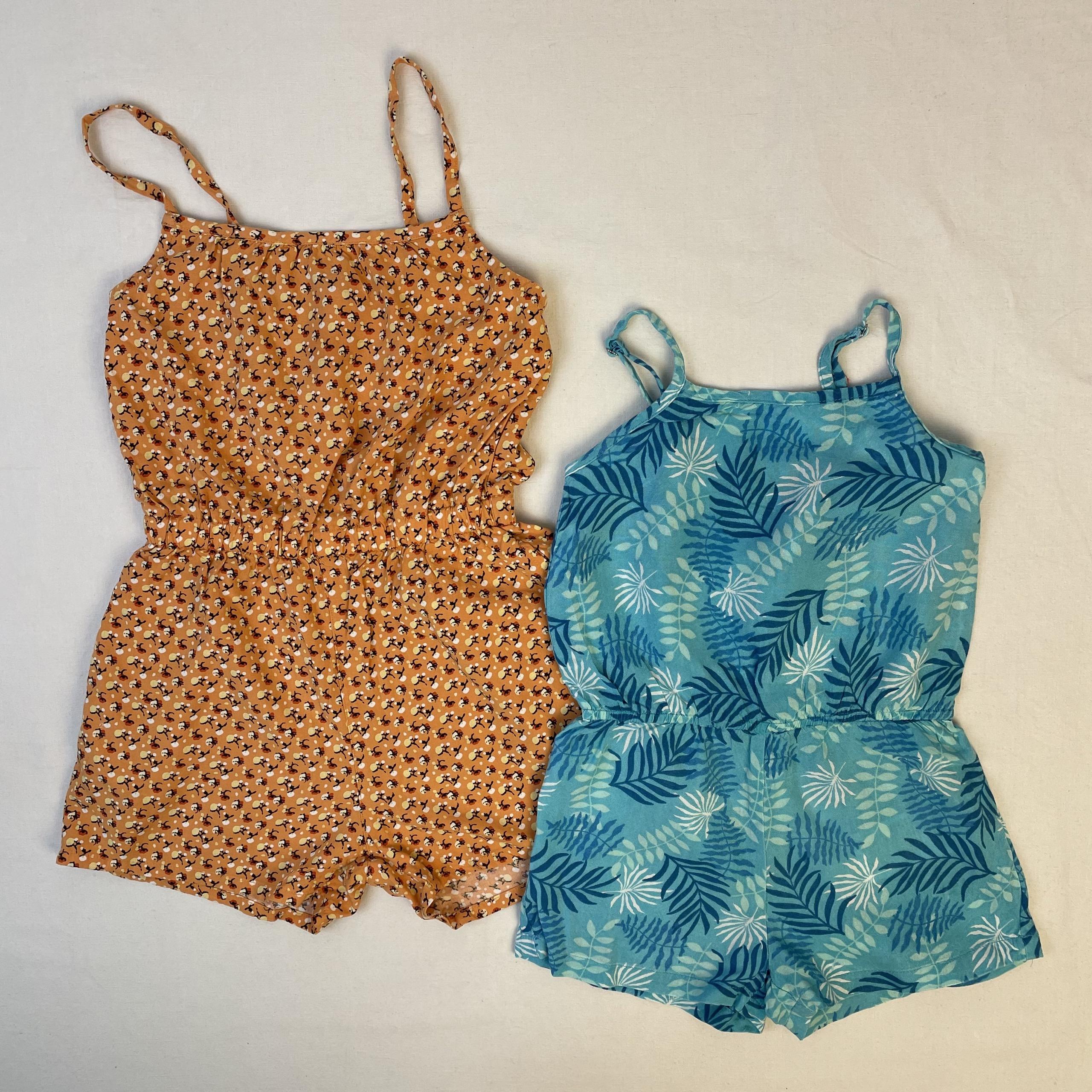 - Lot de 2 combinaisons courtes, bretelles réglables, taille et haut élastiques: orange de marque UniQlo, motif floral; bleu du marque Kéawa, motif floral.