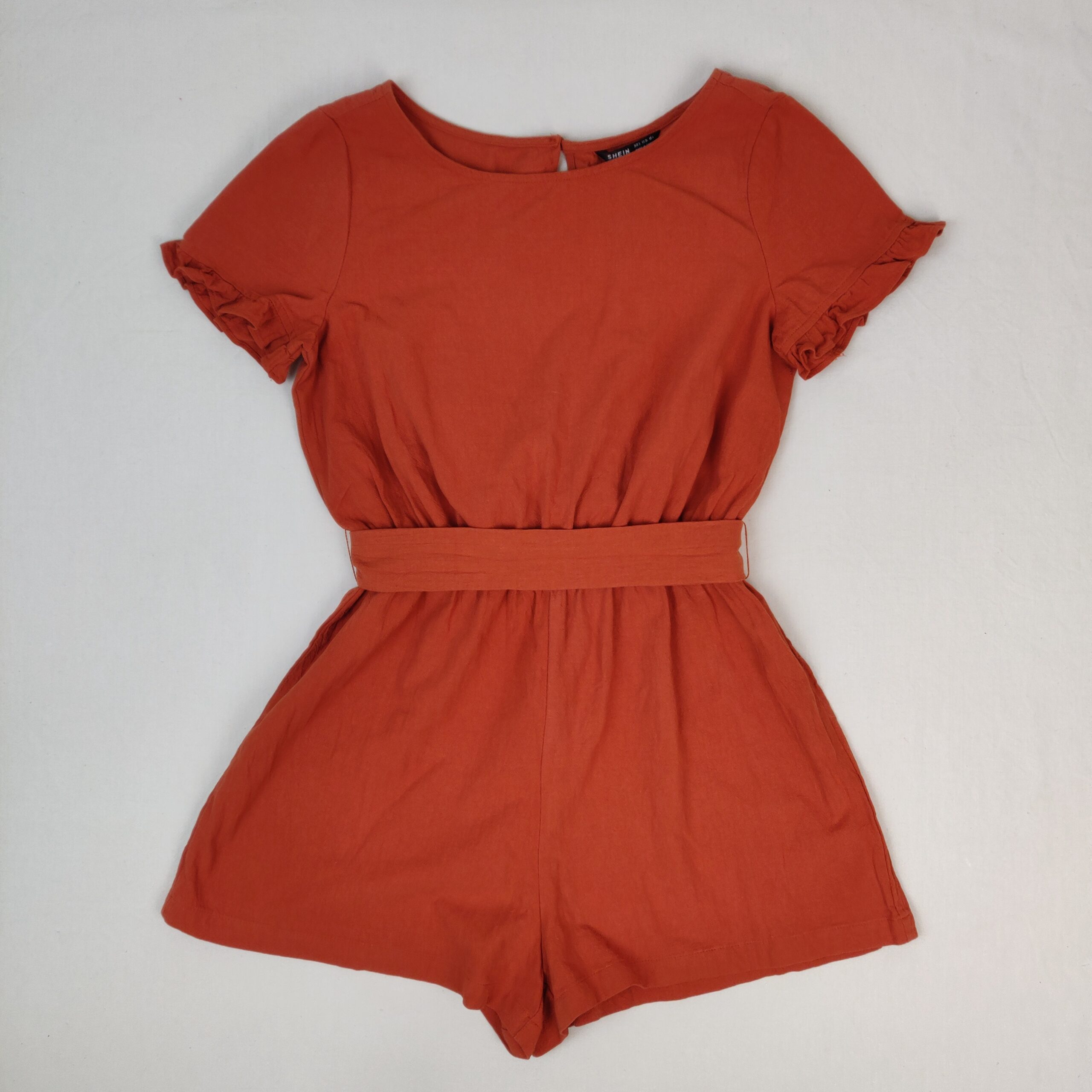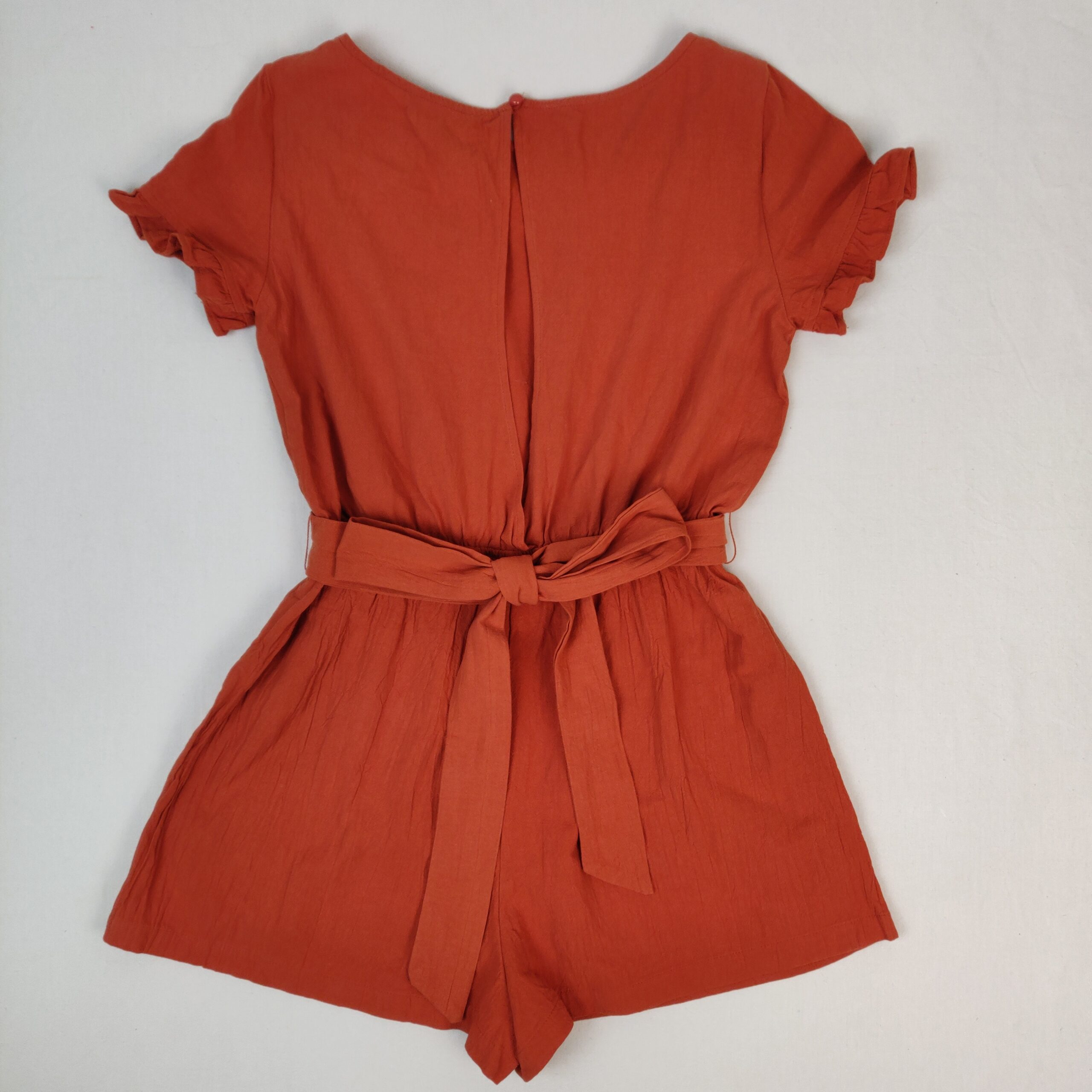 Autres commentaires : Combi-short orange à manches courtes, taille élastique, fermeture par bouton en haut du dos, ceinture à nouer, manches courtes volantées.