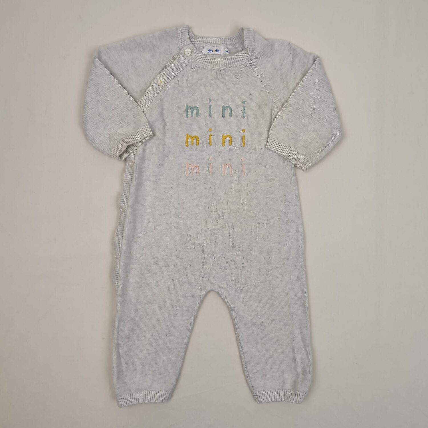 Autres commentaires : 30% polyamide. Combinaison longue à manches longues; gris-blanc en tricot, bordures côtelées, inscriptions ‘mini’ brodées en bleu, jaune et rose, col rond, fermeture par boutons sur le côté droit.