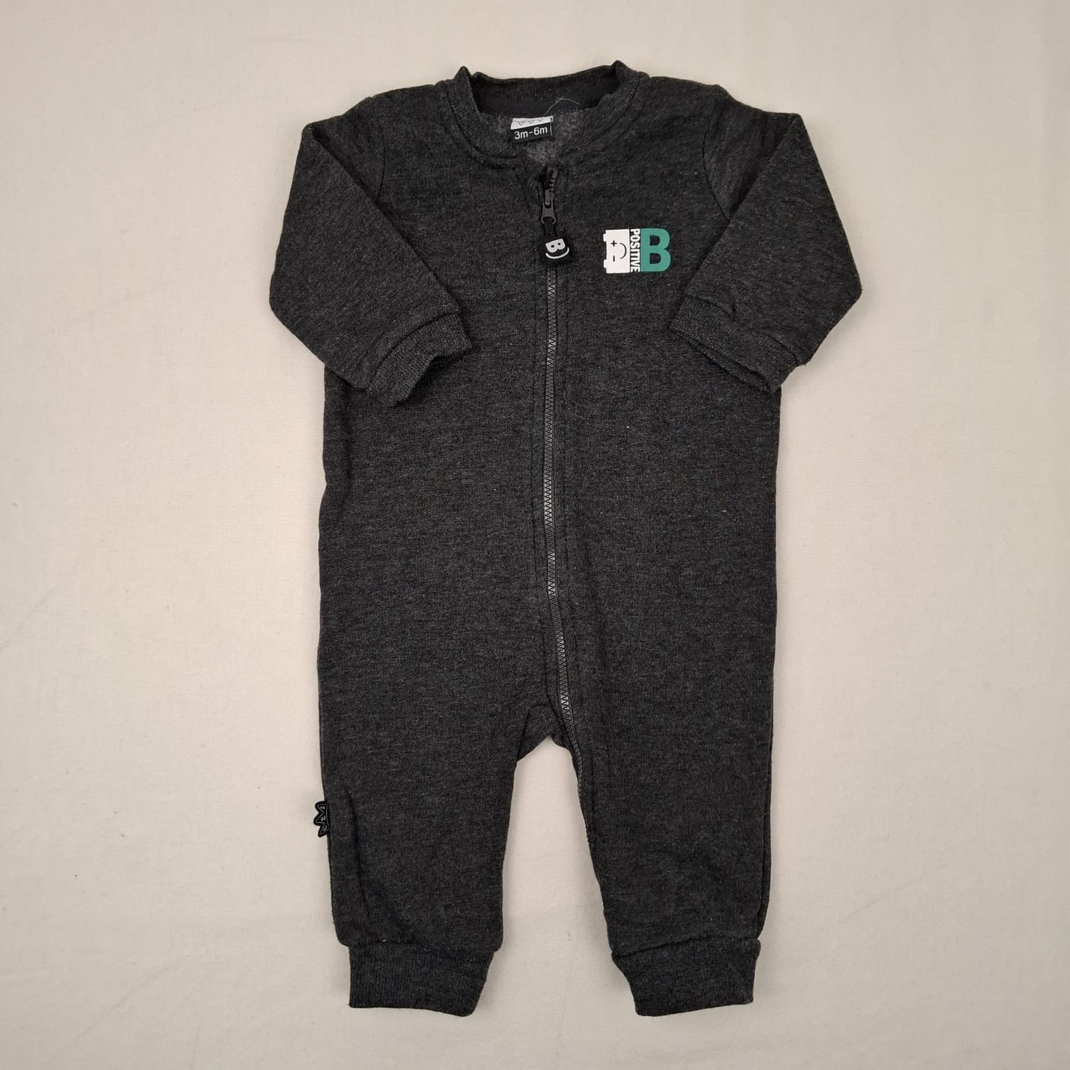 Autres commentaires : 35% polyester. Combinaison longue à manches longues gris foncé, doublure duveteuse, fermeture devant par zip, sans pieds, élastiqué aux chevilles.