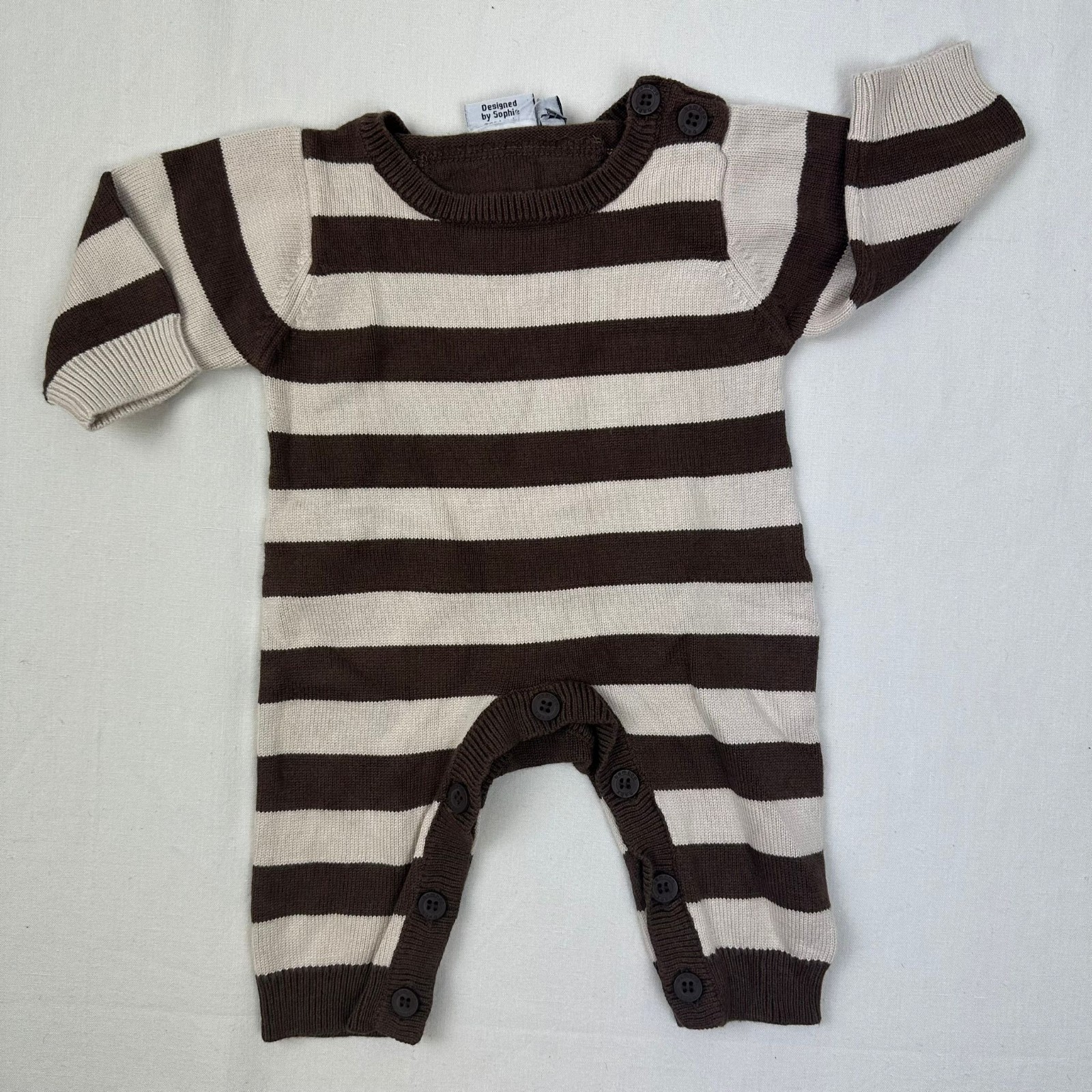 Autres commentaires : 30% coton.Combinaison longue marron manches longues marron et beige à rayures avec une fermeture sur le bas par boutons.