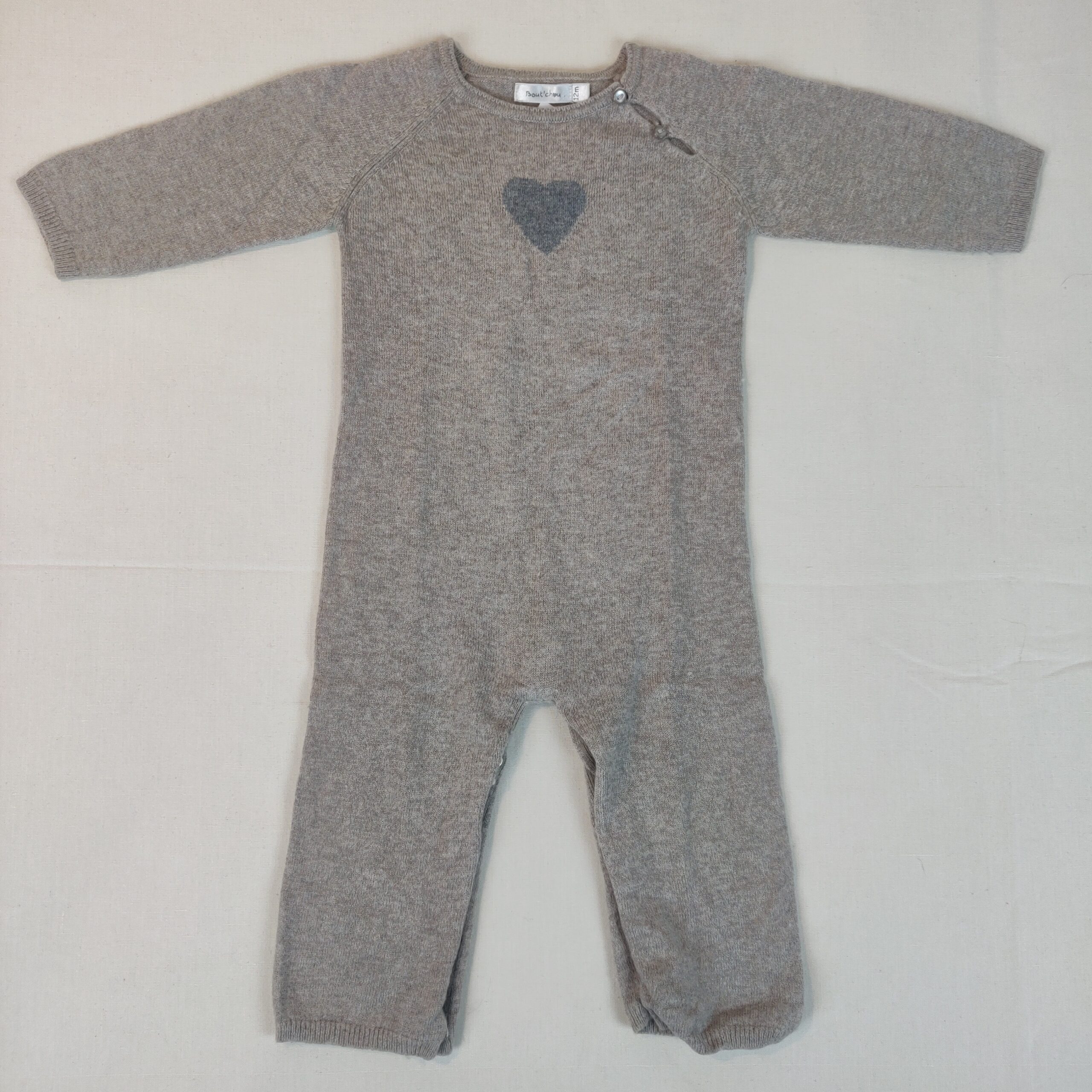 Autres commentaires : 23% polyamide, 18% coton, 18% laine, 4% angora, 4% cachemire. Combinaison longue très douce, couleur taupe avec motif coeur gris sur le torse. Fermeture par 2 boutons à l’épaule gauche, et boutons pression à l’entrejambe.