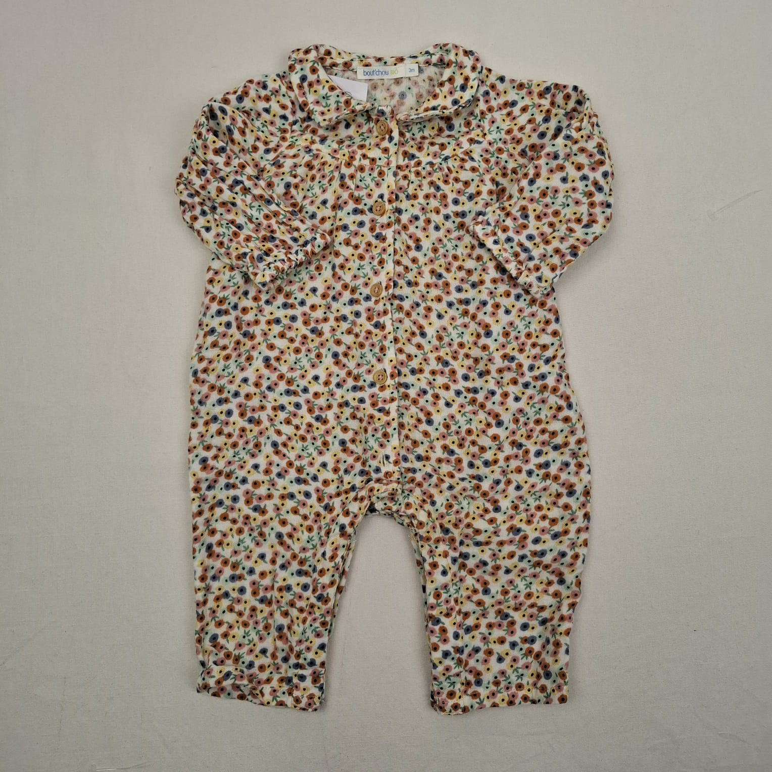 Autres commentaires : Combinaison longue écru à manches longues, imprimé fleuri multicolore, col Claudine, un peu froncé à partir du buste, fermeture devant par petits boutons et par boutons pression à l’entrejambre. Gamme Bio.