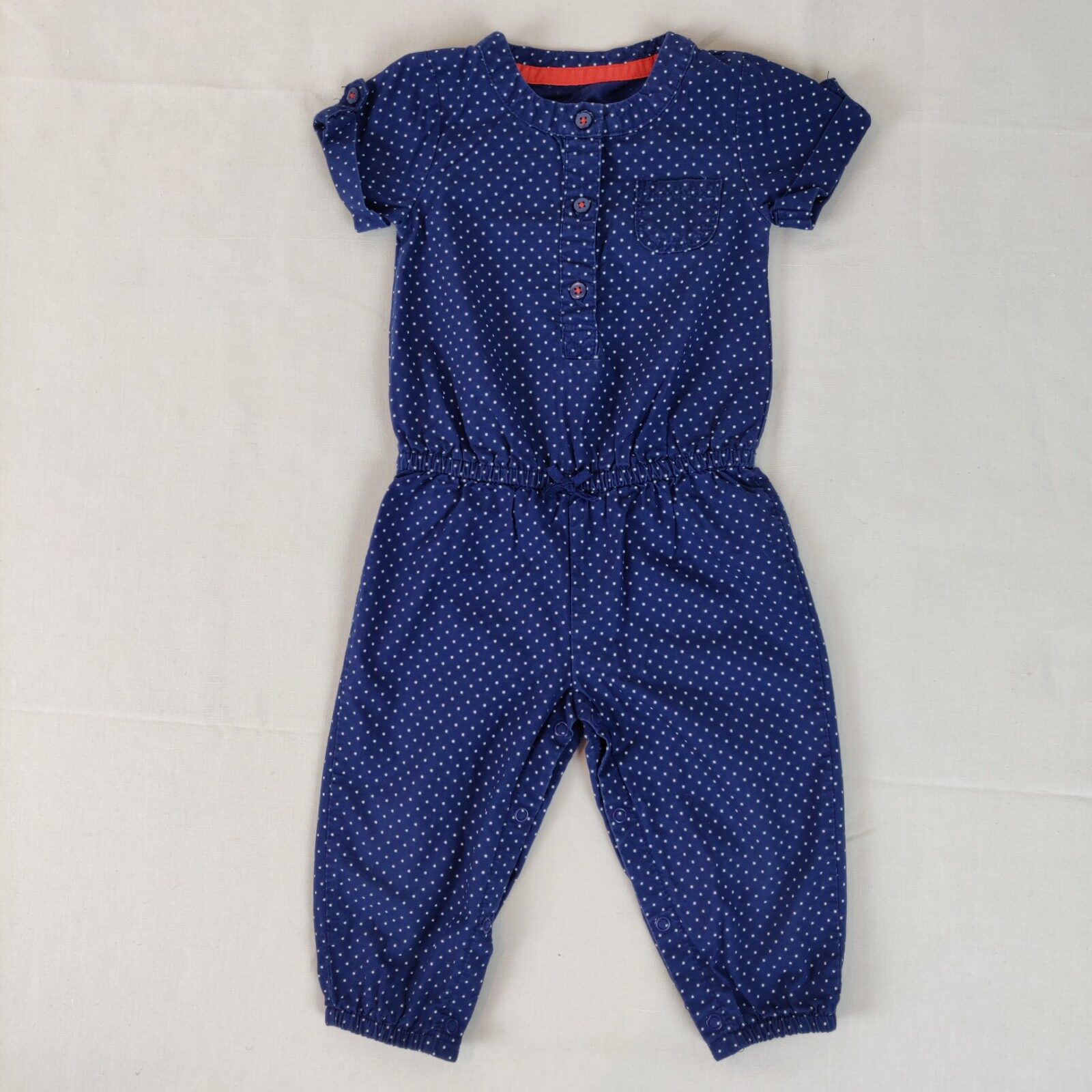Autres commentaires : Combinaison longue à manches courtes retroussées – bleu marine à pois blancs – ouverture centrale à partir du col à 3 boutons classiques. Taille ornée d’un noeud décoratif élastique et chevilles élastiques. Ouverture à l’entre-jambe à boutons pression.