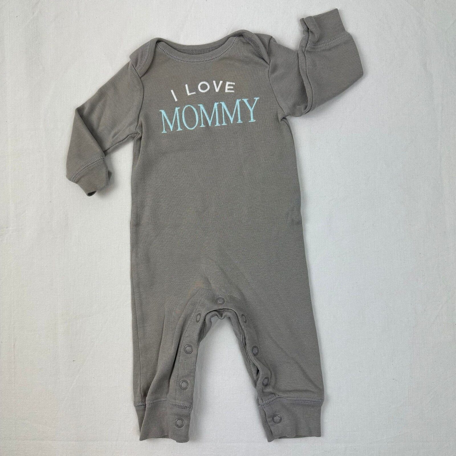 Autres commentaires : Combinaison longue manches longues avec motif « I love mommy » et une fermeture au niveau des jambes par boutons pressions.