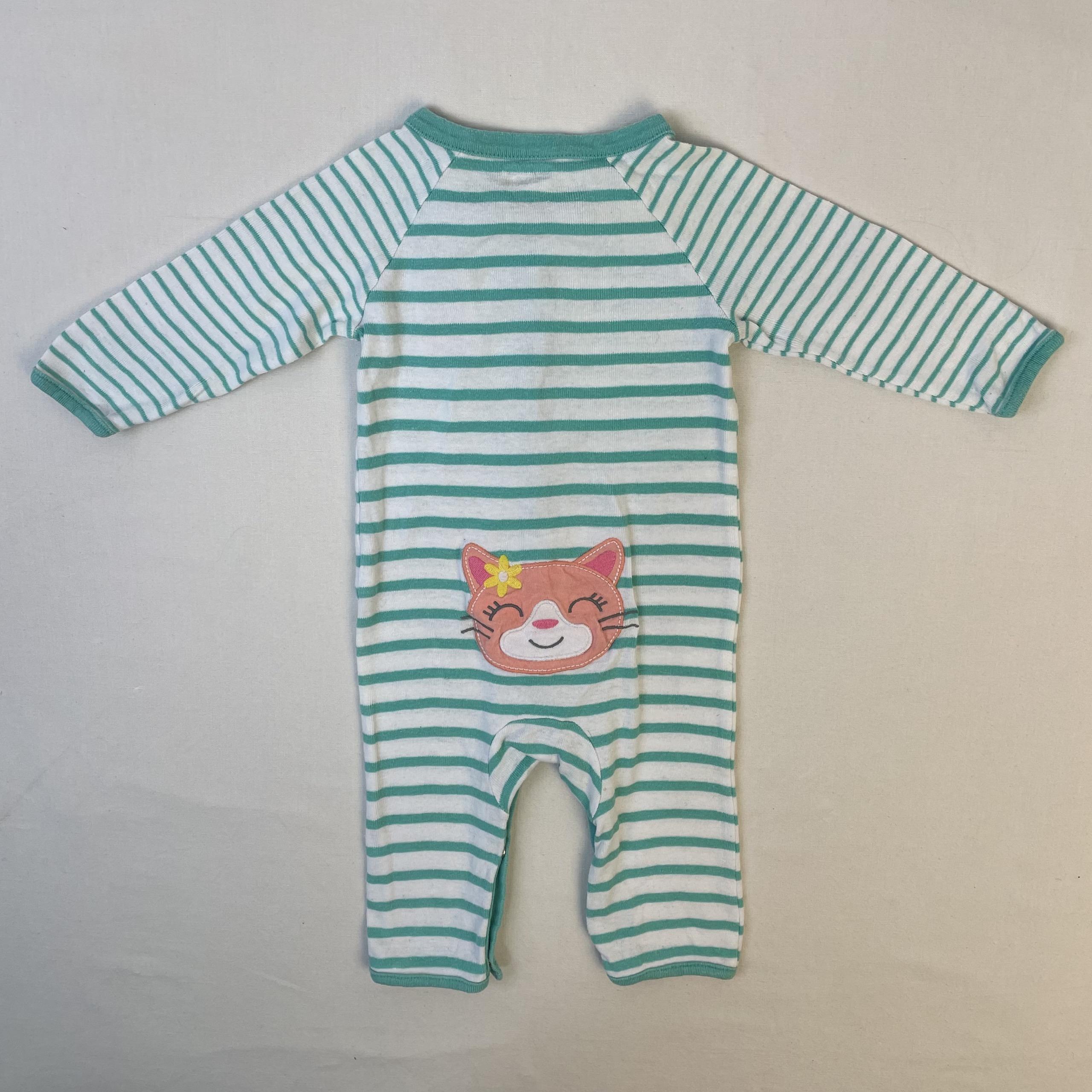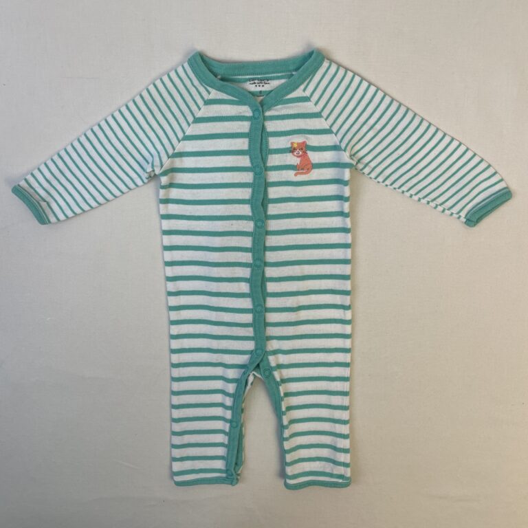 - combinaison longue en velours blanche à rayures turquoise, devant et au dos motif chat brodé, fermeture devant par boutons pression.