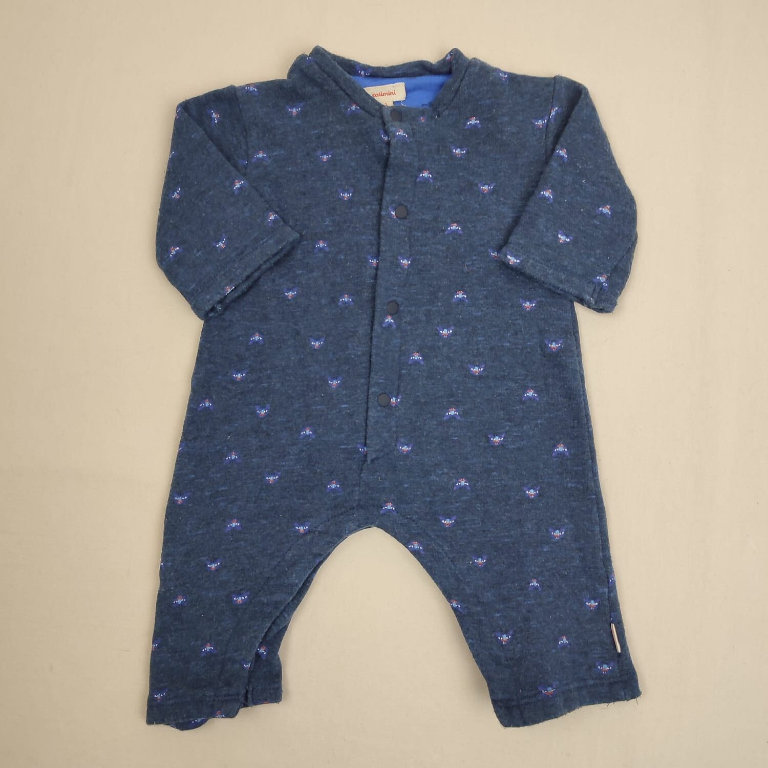 Autres commentaires : 25% polyester. Combinaison longue bleue, imprimé mini têtes de chat, fermeture par boutons pression à l’avant et à l’entrejambe.