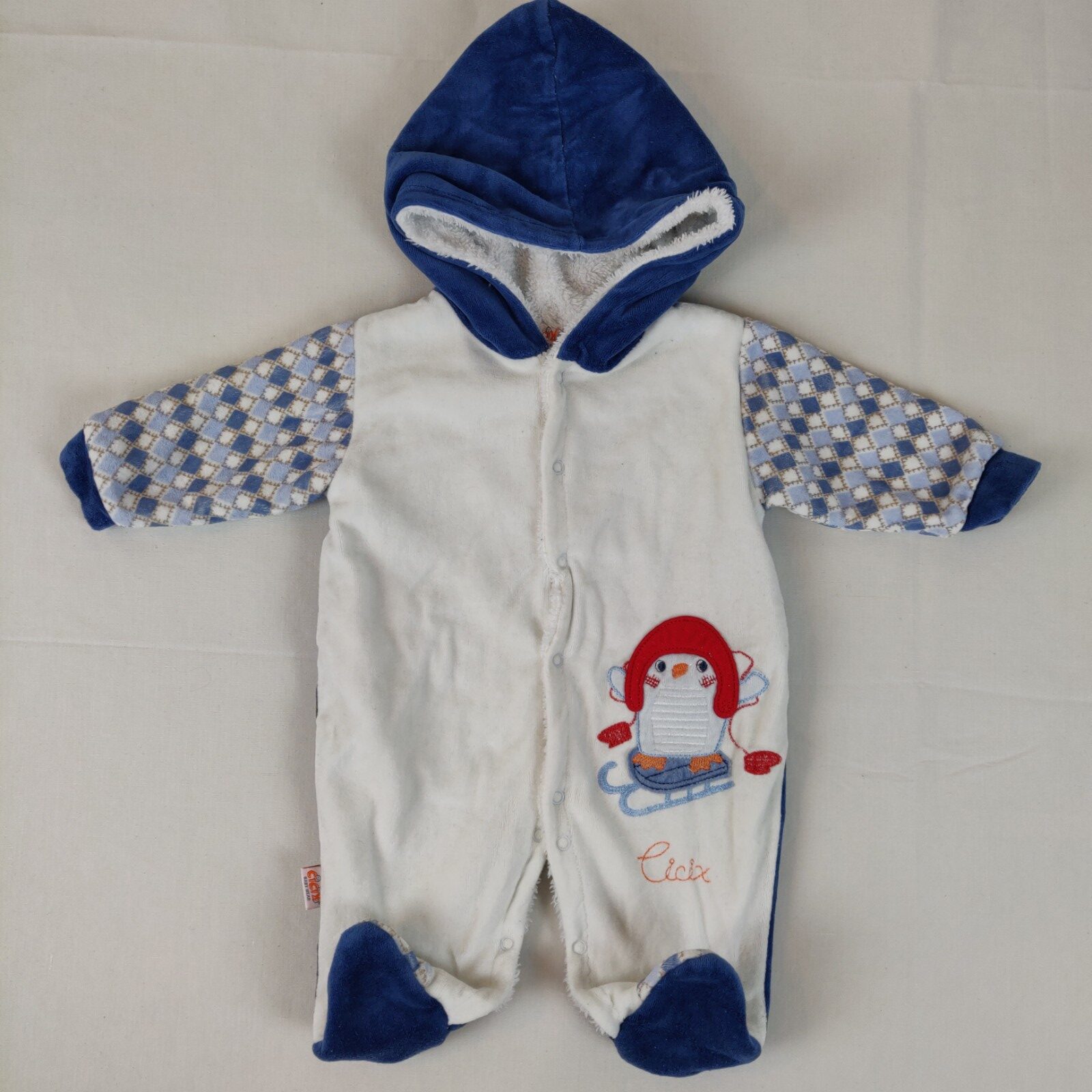 Autres commentaires : 20% Viscose. Combinaison longue à capuche – doublée – blanc sur le devant et bleu à l’arrière avec les manches et les pieds bleus à motifs losanges. Motif pingouin sur luge. Ouverture centrale et à l’entre-jambe à boutons pression. Usure normale du vêtement liée à la matière.