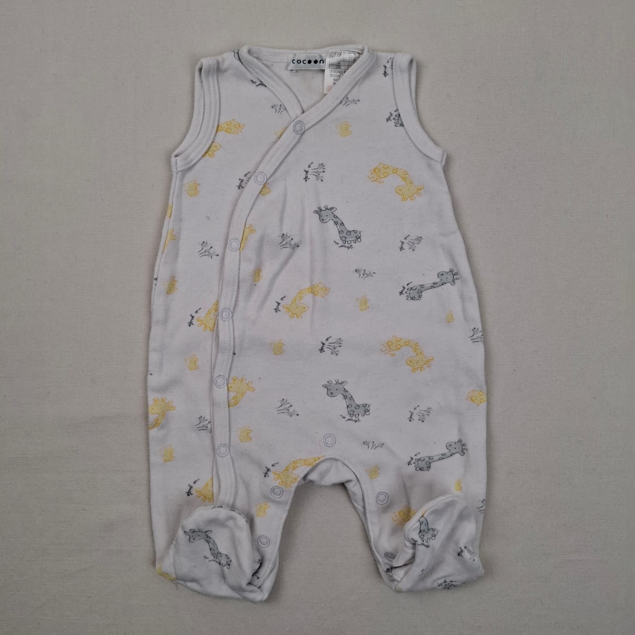 Autres commentaires : Combinaison longue blanche, sans manches et avec pieds, parsemé de girafes et pissenlits jaunes, gris et bleus, taille estimée à 1 mois.