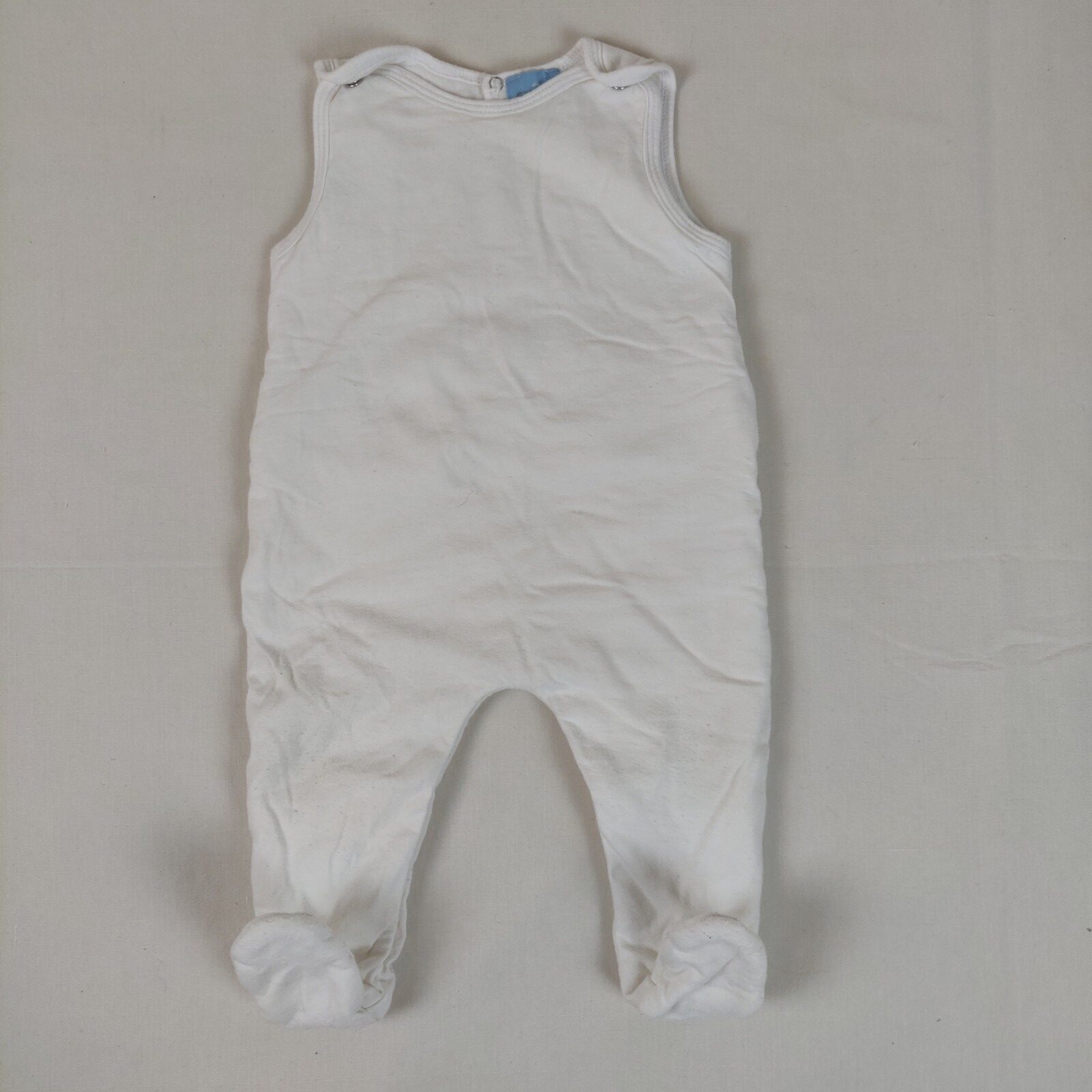 Autres commentaires : Combinaison longue à pieds et à bretelles s’attachant par une pression – blanc. Ouverture pressionnée au dos. Léger effet pelucheux.