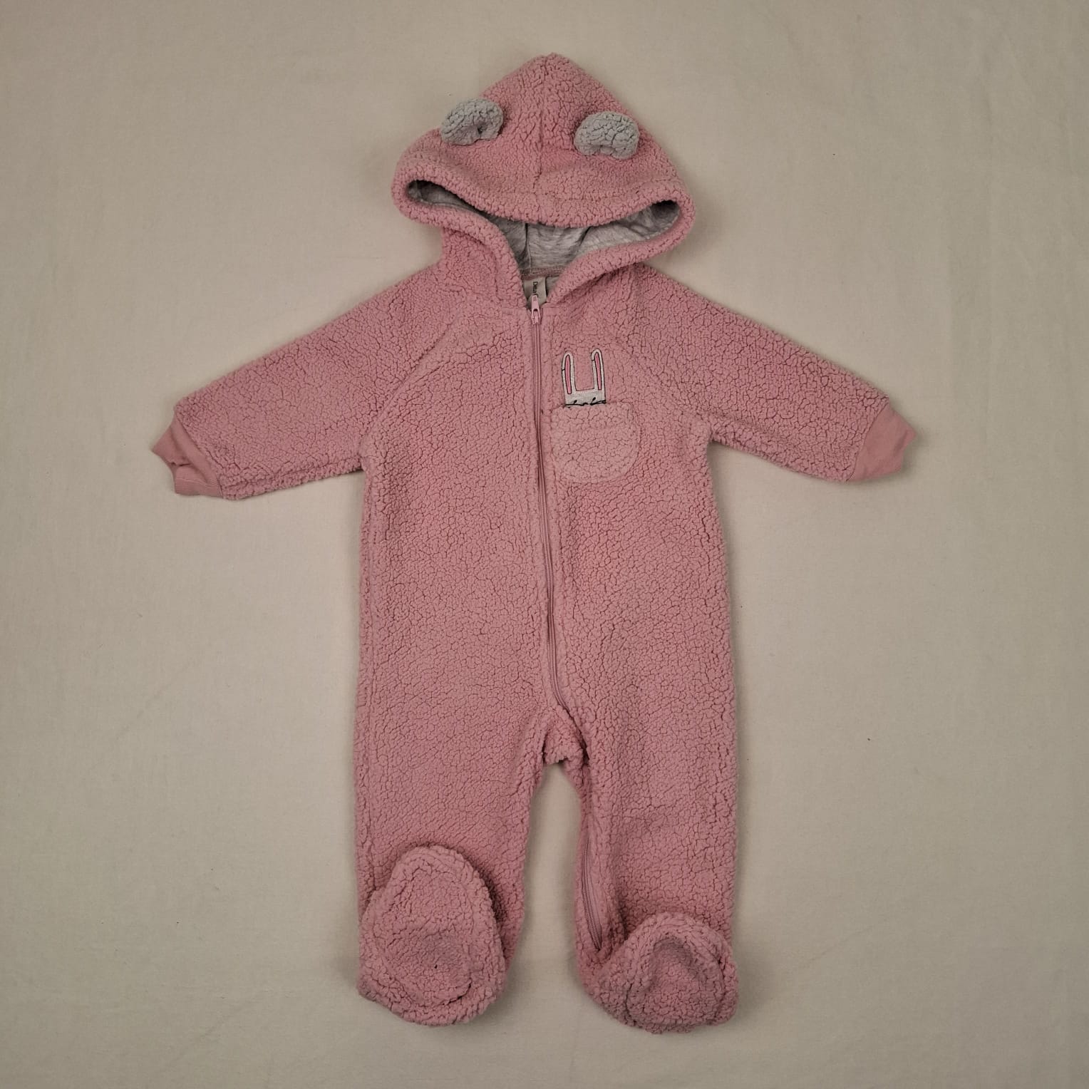 Autres commentaires : Combinaison longue à capuche en sherpa rose, devant motif tête de lapin blanc, capuche avec petites oreilles grises et haut du dos doublés de jersey de coton grège, fermeture complète devant par zip.