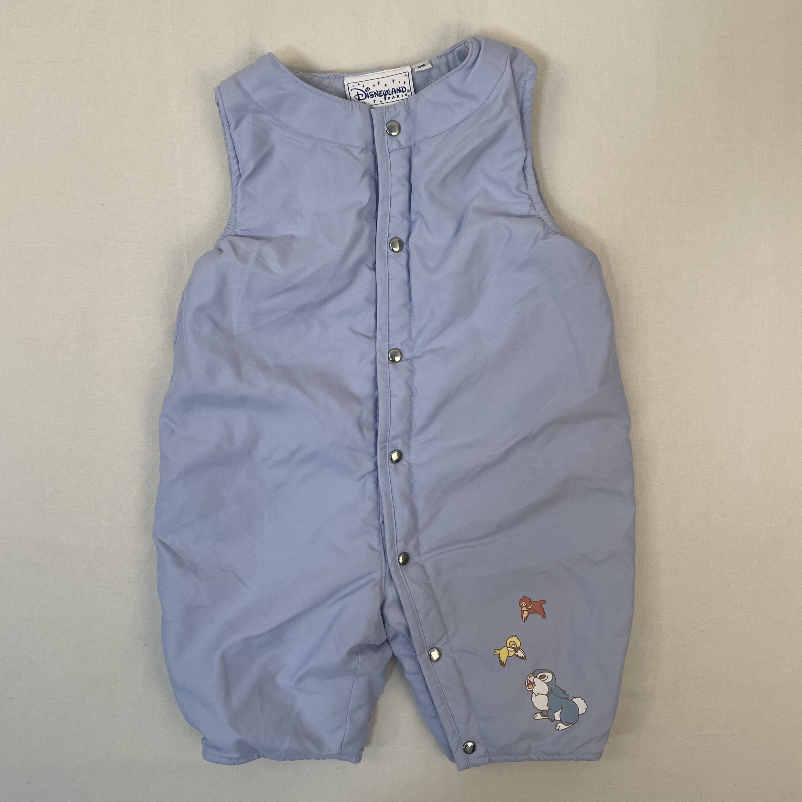 - Combinaison chaude bleu lavande clair sans manches, devant motif lapin et oiseaux de Disney, fermeture devant et à l’entrejambe par boutons pression, doublure bleu clair en 65% coton et 35% polyester et garnissage 100% polyester.