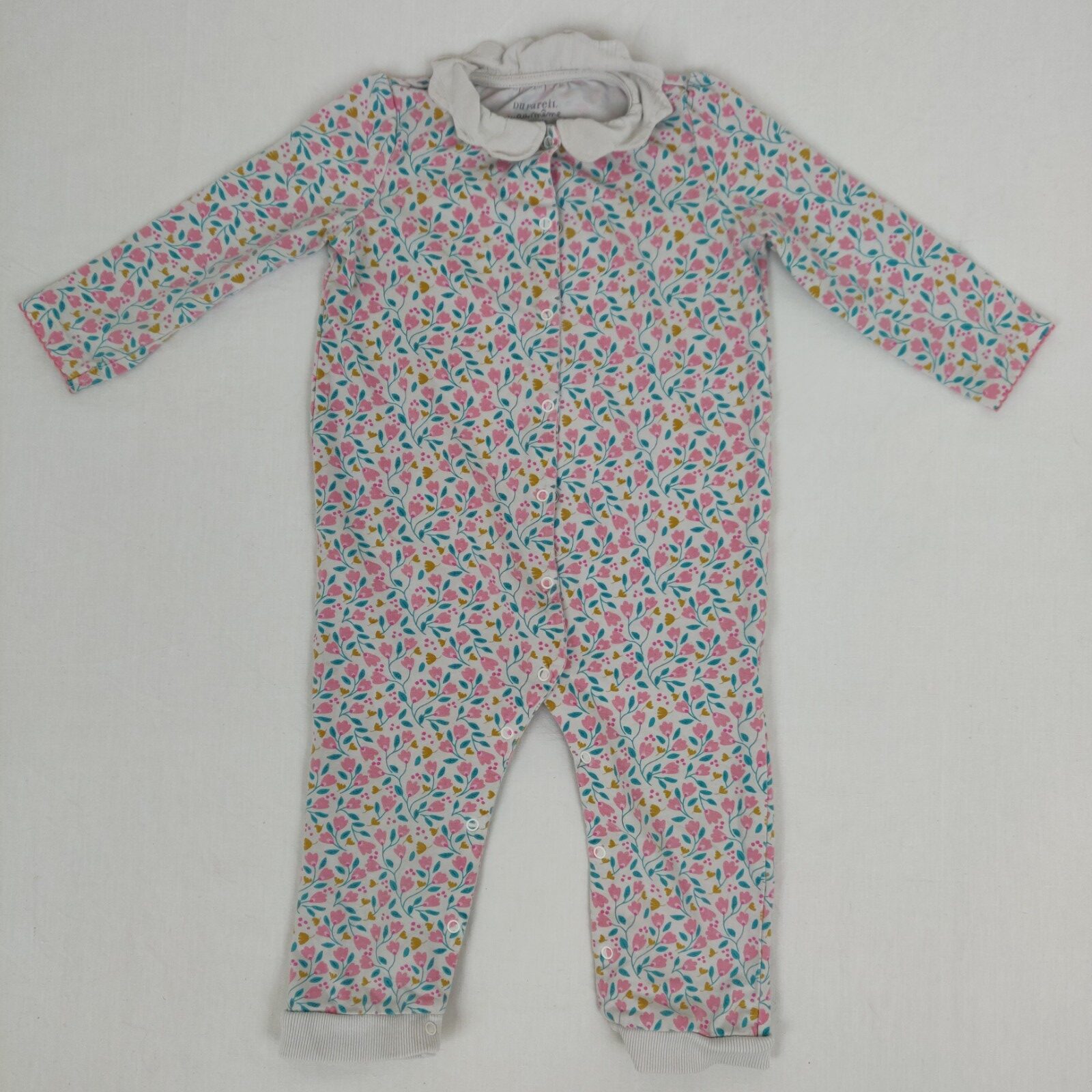 Autres commentaires : 4% elasthanne. Combinaison longue sans pieds blanche fleurie en rose et bleu, col claudine et une fermeture par boutons pressions devant.