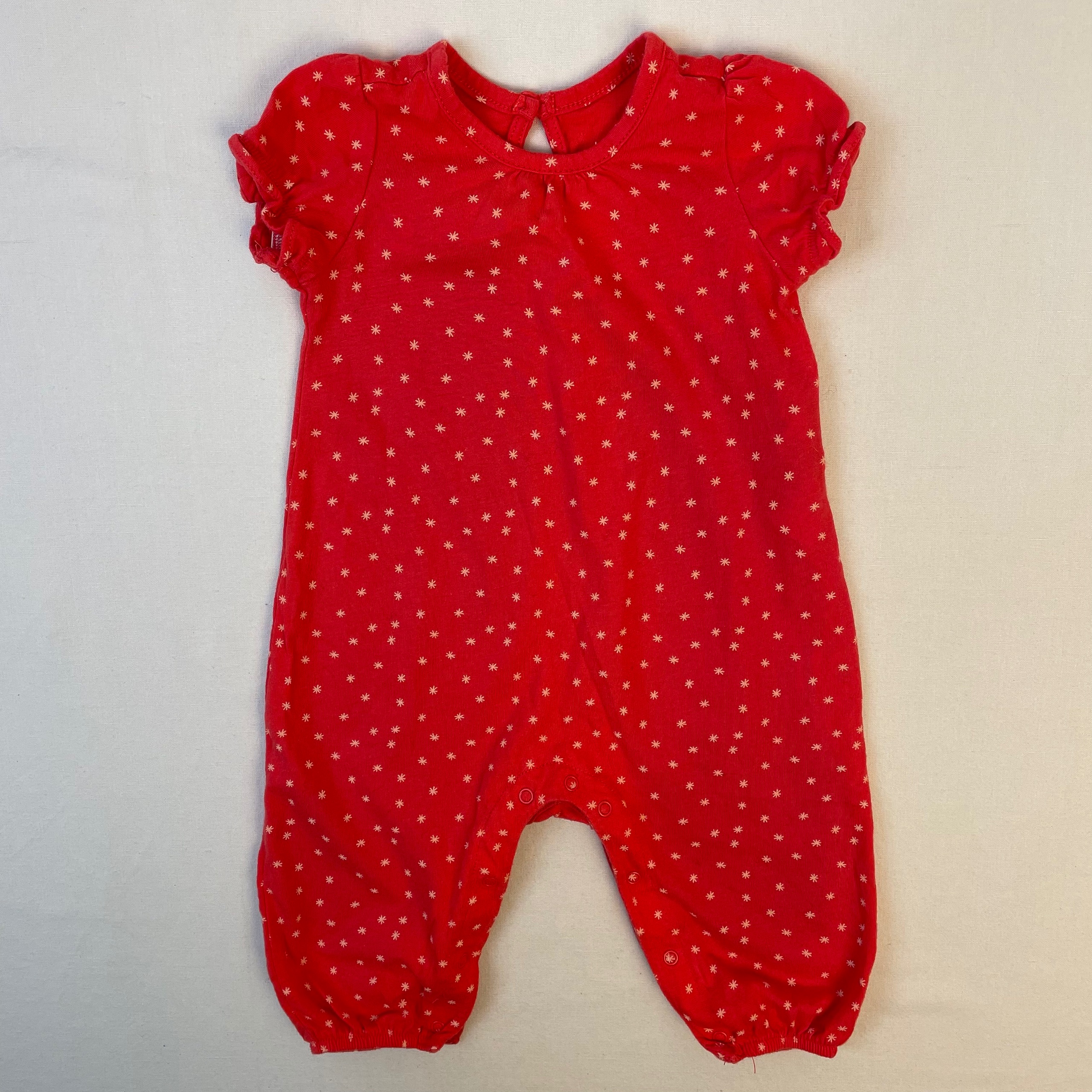 - Combinaison longue à manches courtes rose foncé avec motifs mini étoiles beige rosé, fermeture à l’entrejambe par boutons pression et en haut du dos par petit bouton classique.