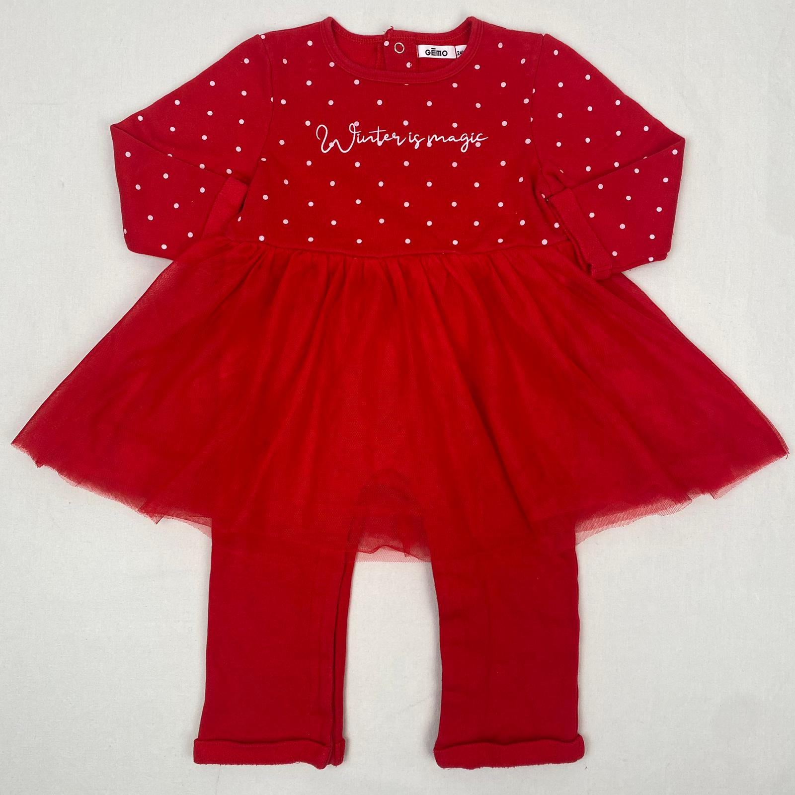 Autres commentaires : 40% polyester pour la matière principale et 5% élasthanne pour bord-côte. Combinaison longue rouge à pois blancs et avec une sur-jupe en tulle, fermeture par bouton pression au dos.