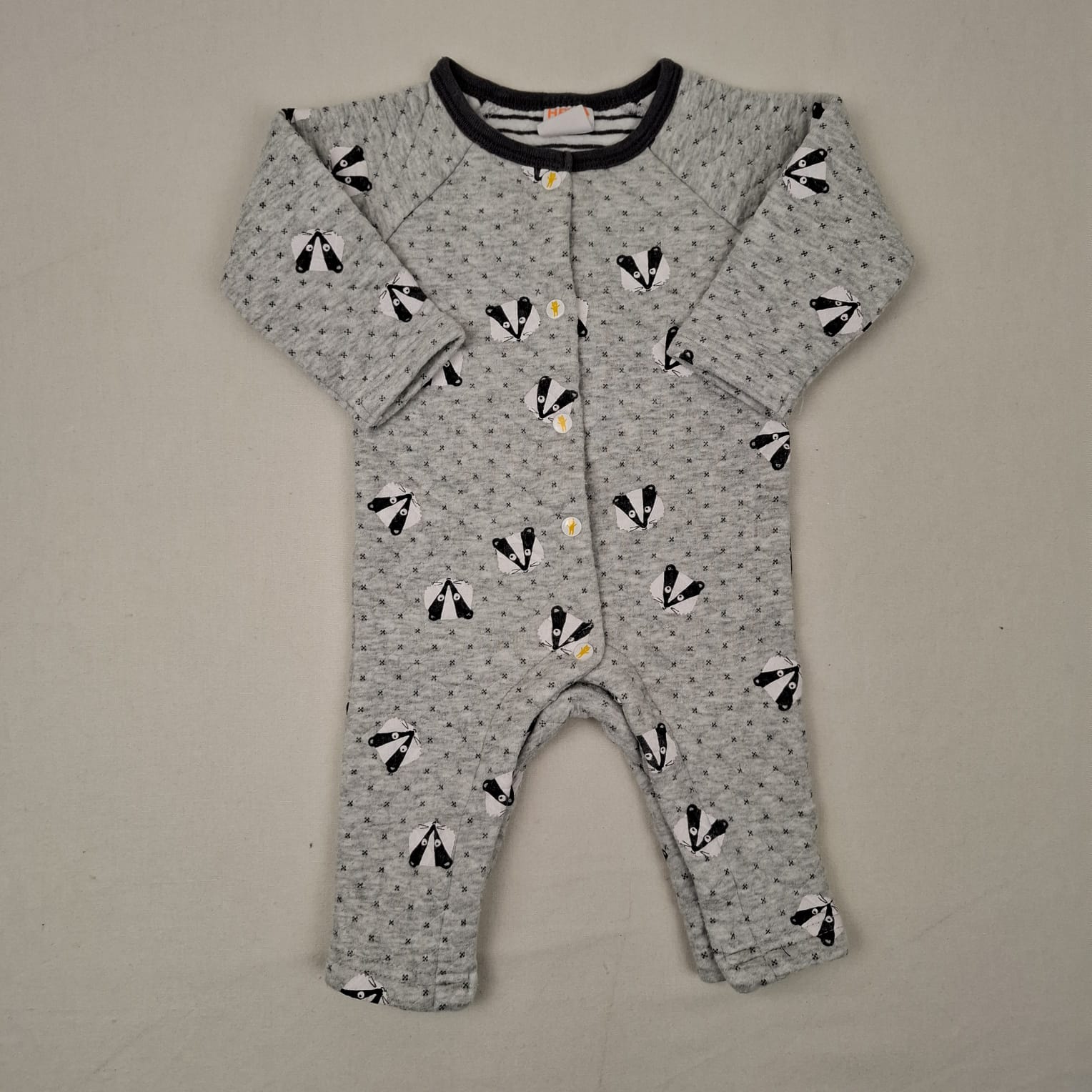 Autres commentaires : Combinaison longue grise à manches longues, sans pieds, tissu molletonné en croisillons, parsemé de tête de loirs, doublure blanche à rayures bleu foncé en coton, fermeture devant et à l’entrejambe par boutons pression.