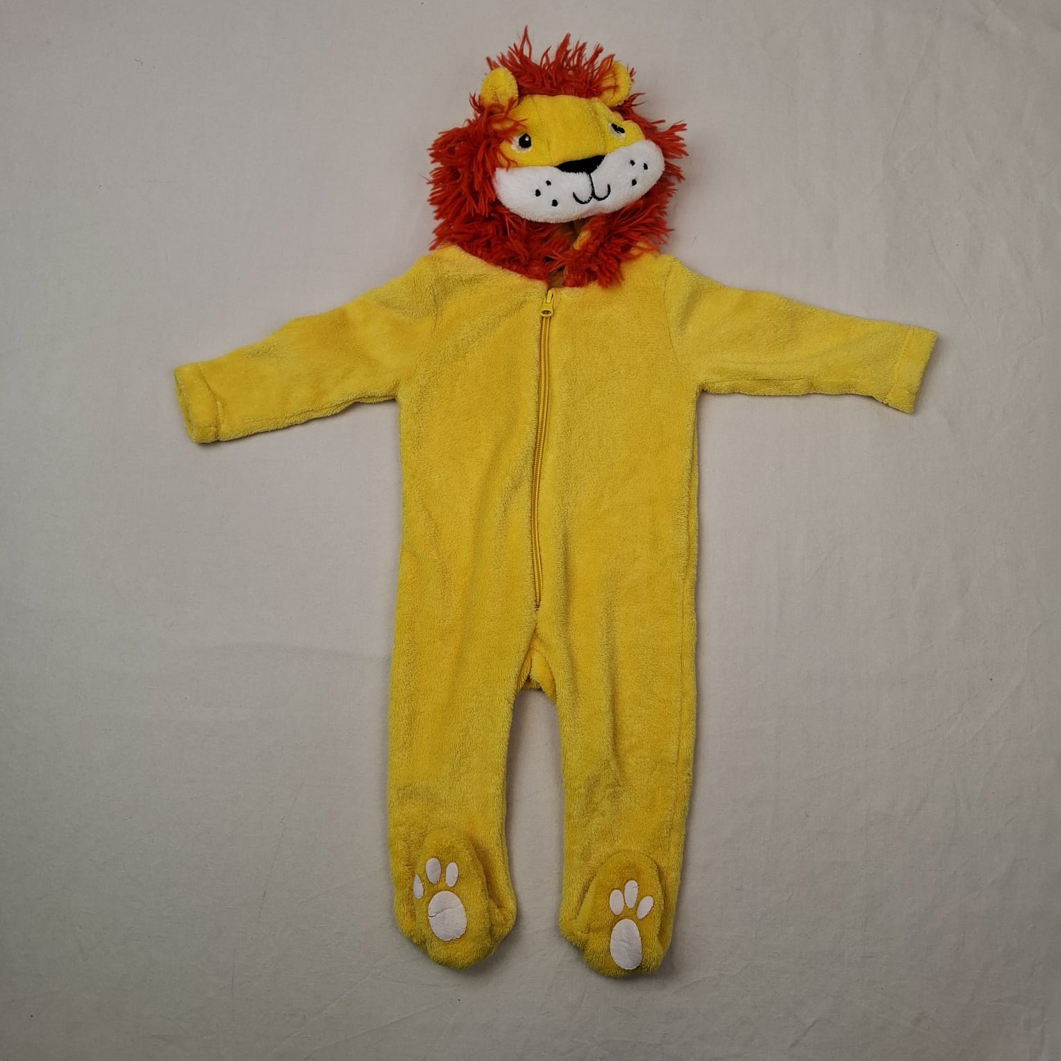 Autres commentaires : Sur-pyjama déguisement lion jaune à capuche, fermeture par zip devant.