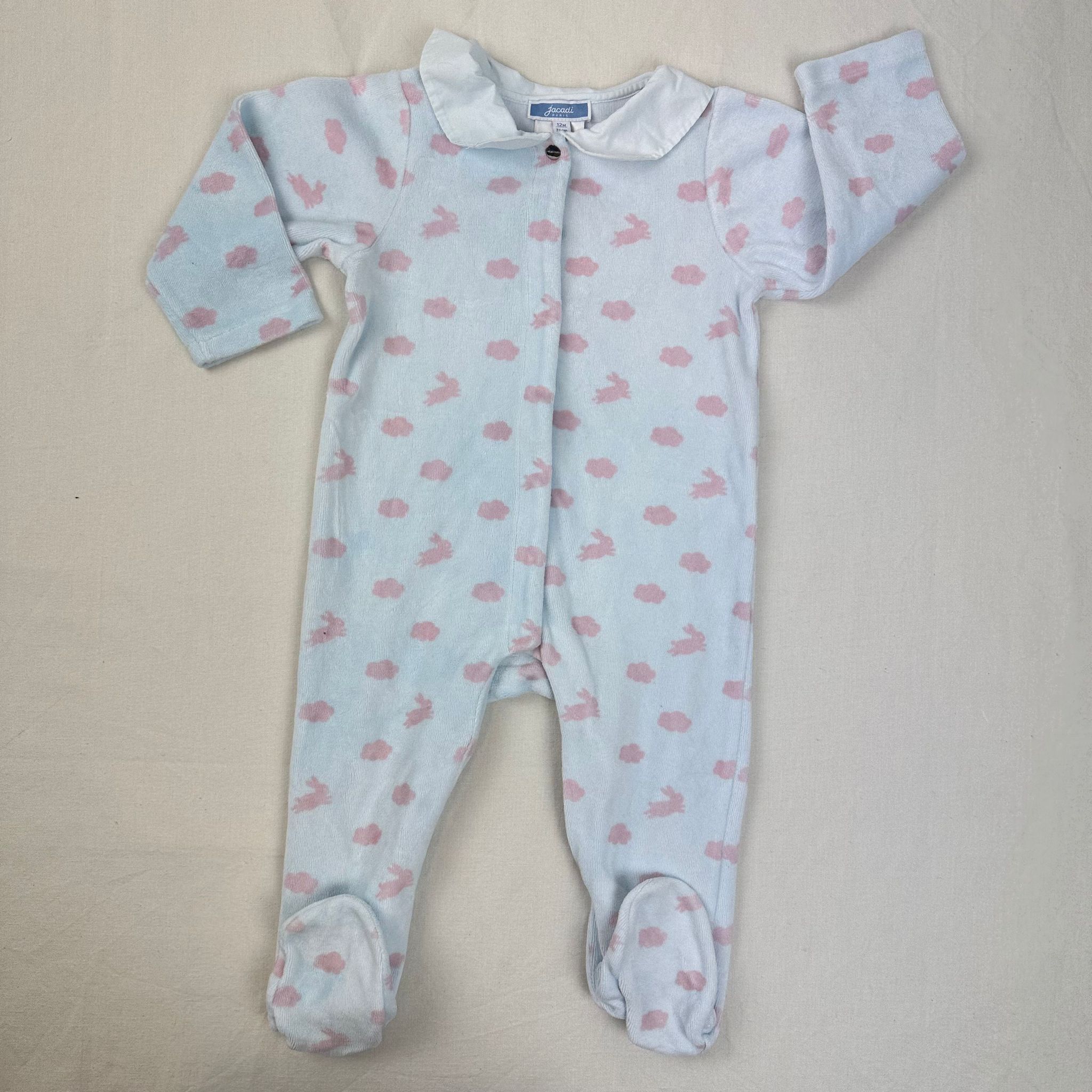 Autres commentaires : Combinaison longue manches longues bleu clair, col claudine blanc avec motif des nuages et des peitts lapins rose.