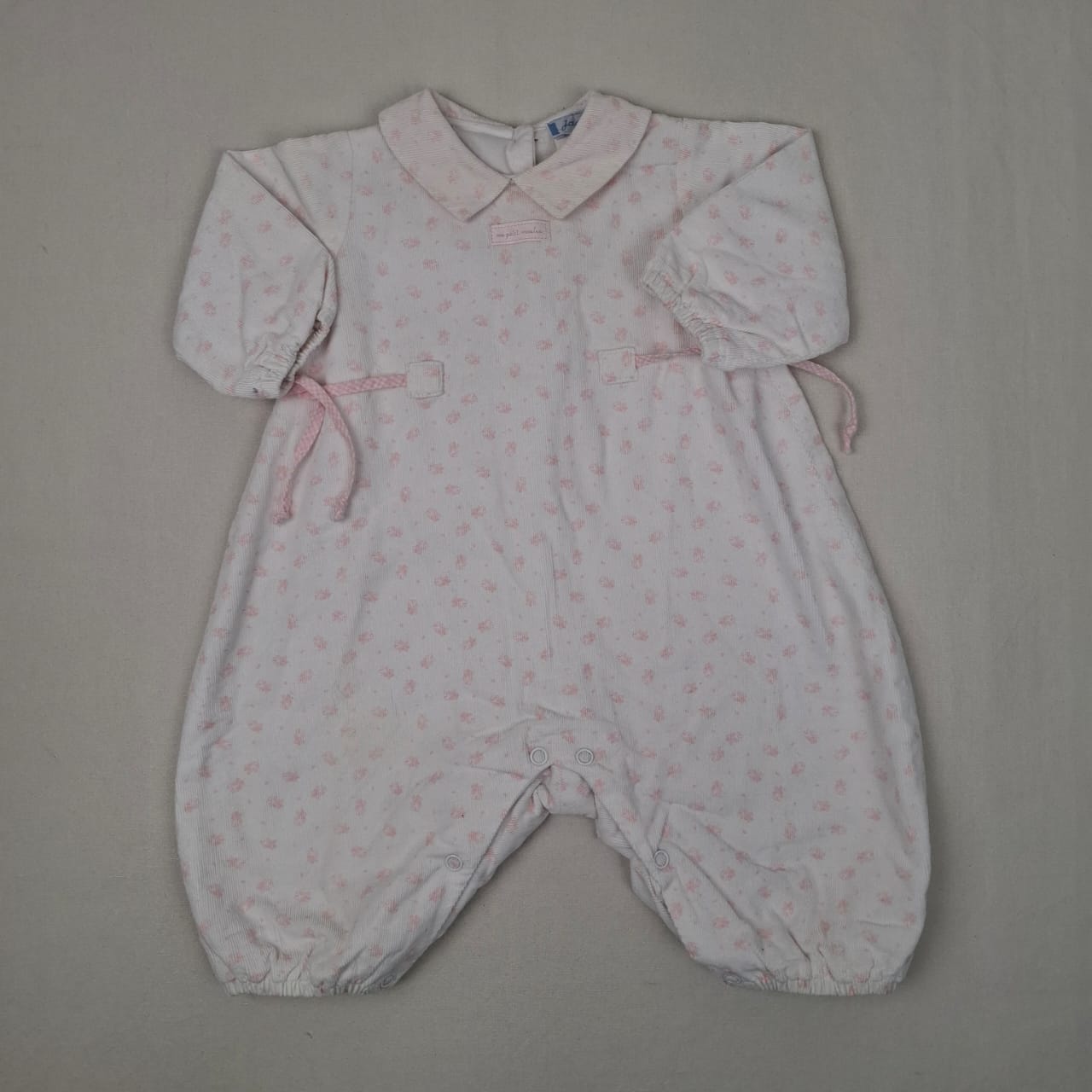 Autres commentaires : Combinaison longue vintage, Jacadi, 3 mois, fermeture avec boutons à l’avant du vêtement, petit cordon pour serrer au niveau de la taille.