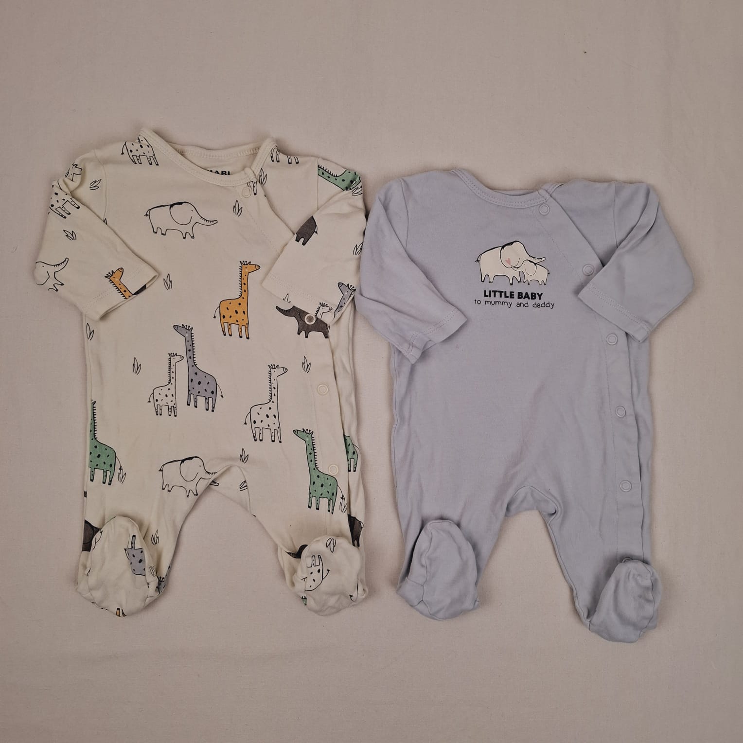 Autres commentaires : Lot de 2 combinaisons longues Kiabi 1M eco conception , coton issu de l’agriculture ,pieds compris , un bleu motifs elephant et un blanc motifs animaux