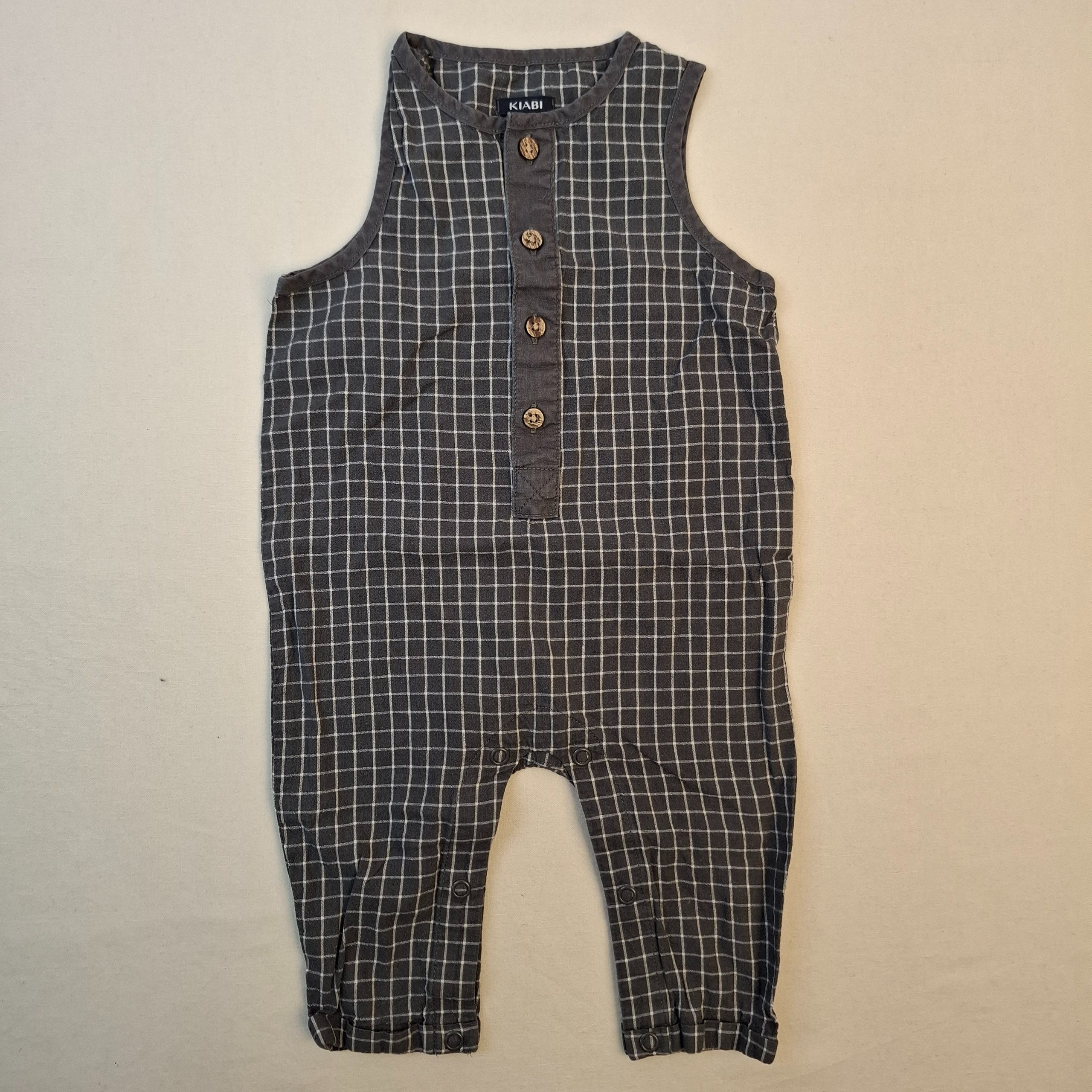 - Combinaison longue sans manches grise à carreaux blancs, fermeture devant par boutons classiques et à l’entrejambe par boutons classiques.