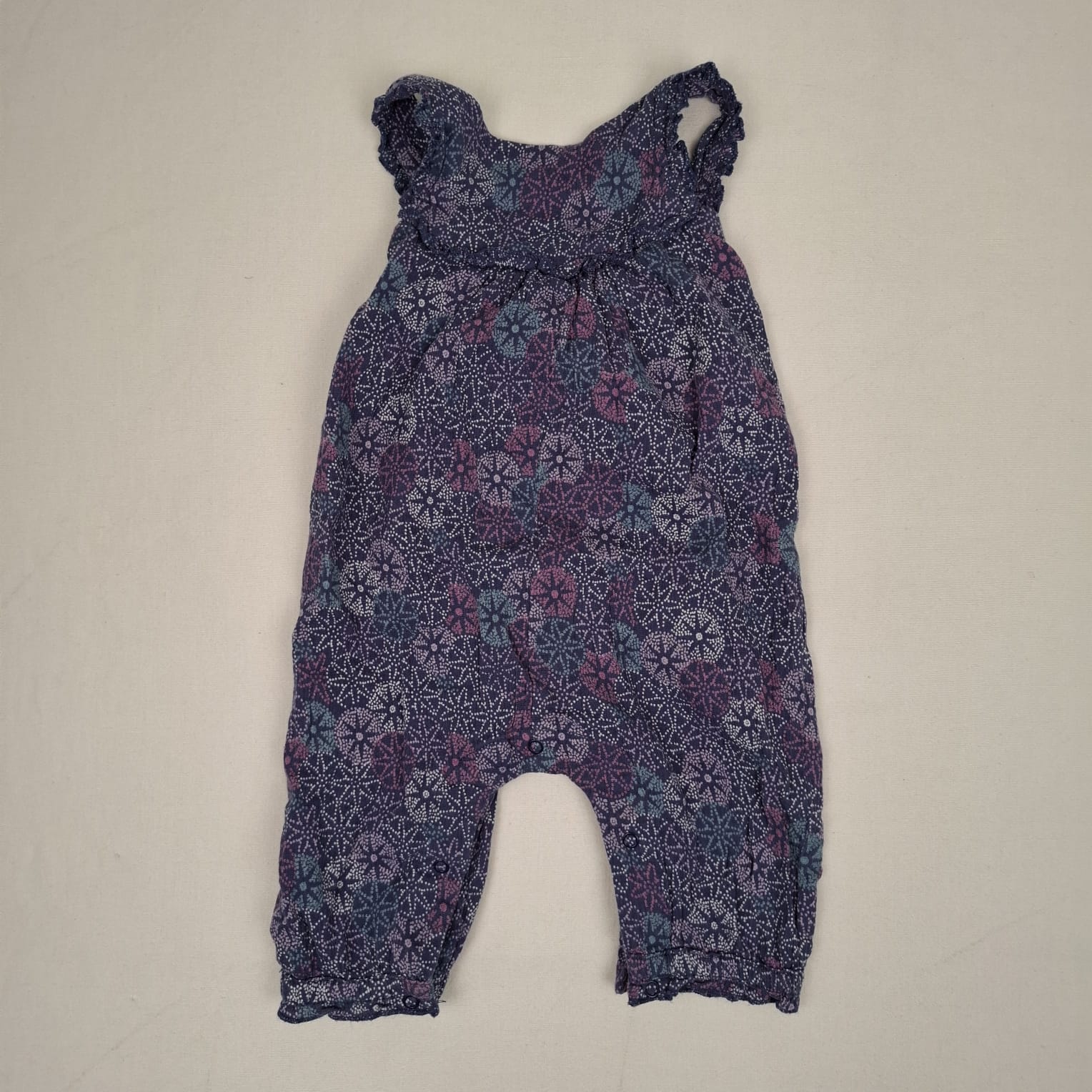 Autres commentaires : Combinaison longue violette parsemée de rosaces en pointillés vertes, roses et mauves, avec bretelles volantées réglables par deux boutons dans le dos, volantée et froncée devant, fermeture à l’entrejambe par boutons pression.